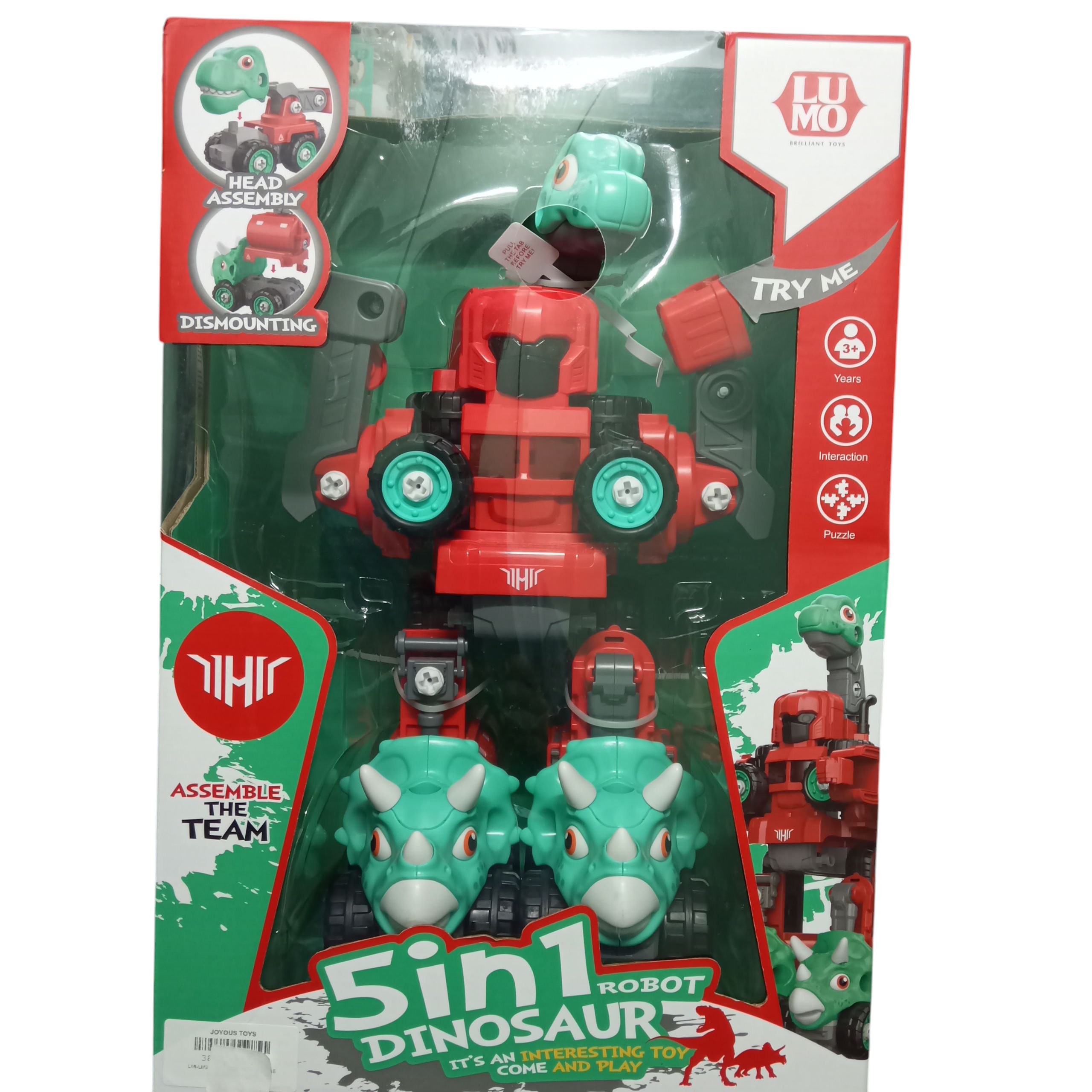 A multi-functional toy that combines dinosaurs and robots into 5 possible forms. Kids can assemble, disassemble, and enjoy interactive play with lights and action.