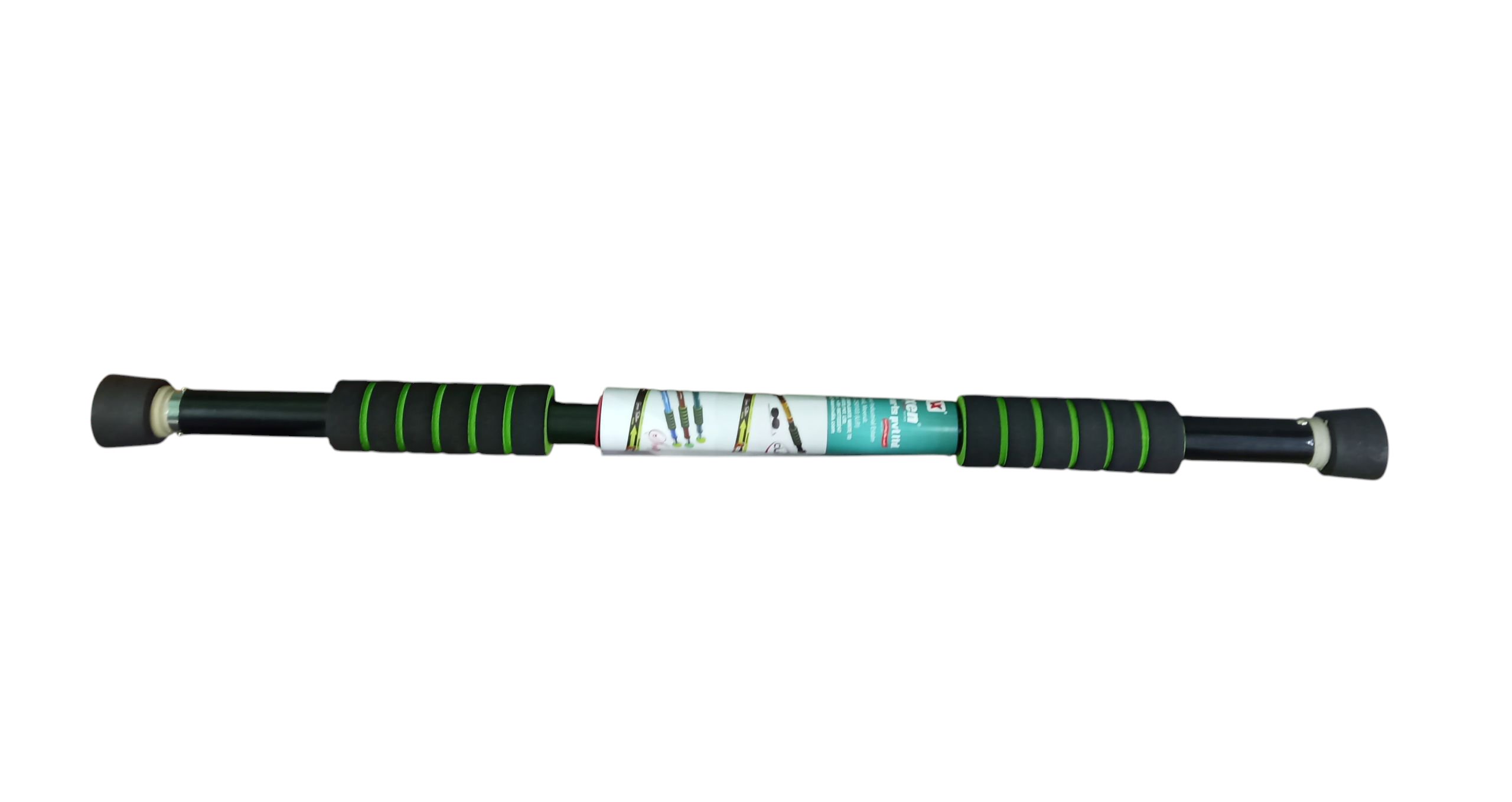 An adjustable pull-up bar designed to fit securely in most standard doorframes without the need for screws or permanent installation. It features foam grips for a comfortable and secure hold, making it ideal for home workouts and strength training exercises.