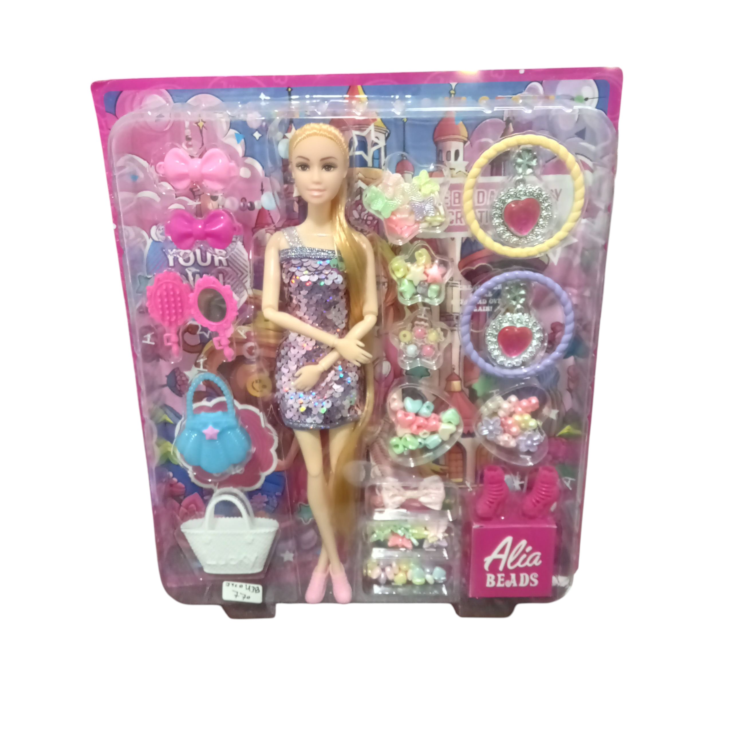 Create sparkling fun with the Alia Beads Doll Set! This charming doll comes with a variety of colorful beads and accessories, perfect for styling and crafting. Kids can design unique jewelry or decorate their doll for endless creative play!