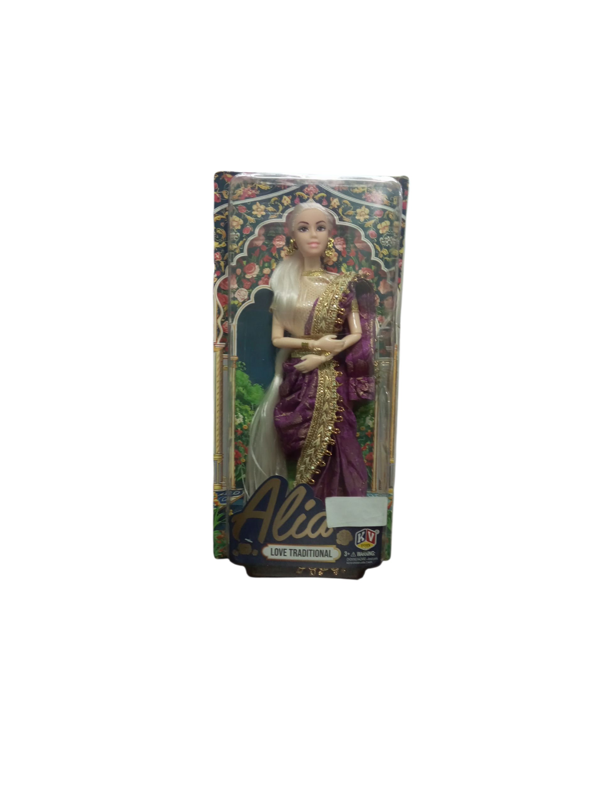 Features a female doll named “Alia” who is dressed in a Traditional Indian outfit, specifically a saree (or a similar traditional wrap/dress) in a rich purple color with elaborate gold trim and beading.