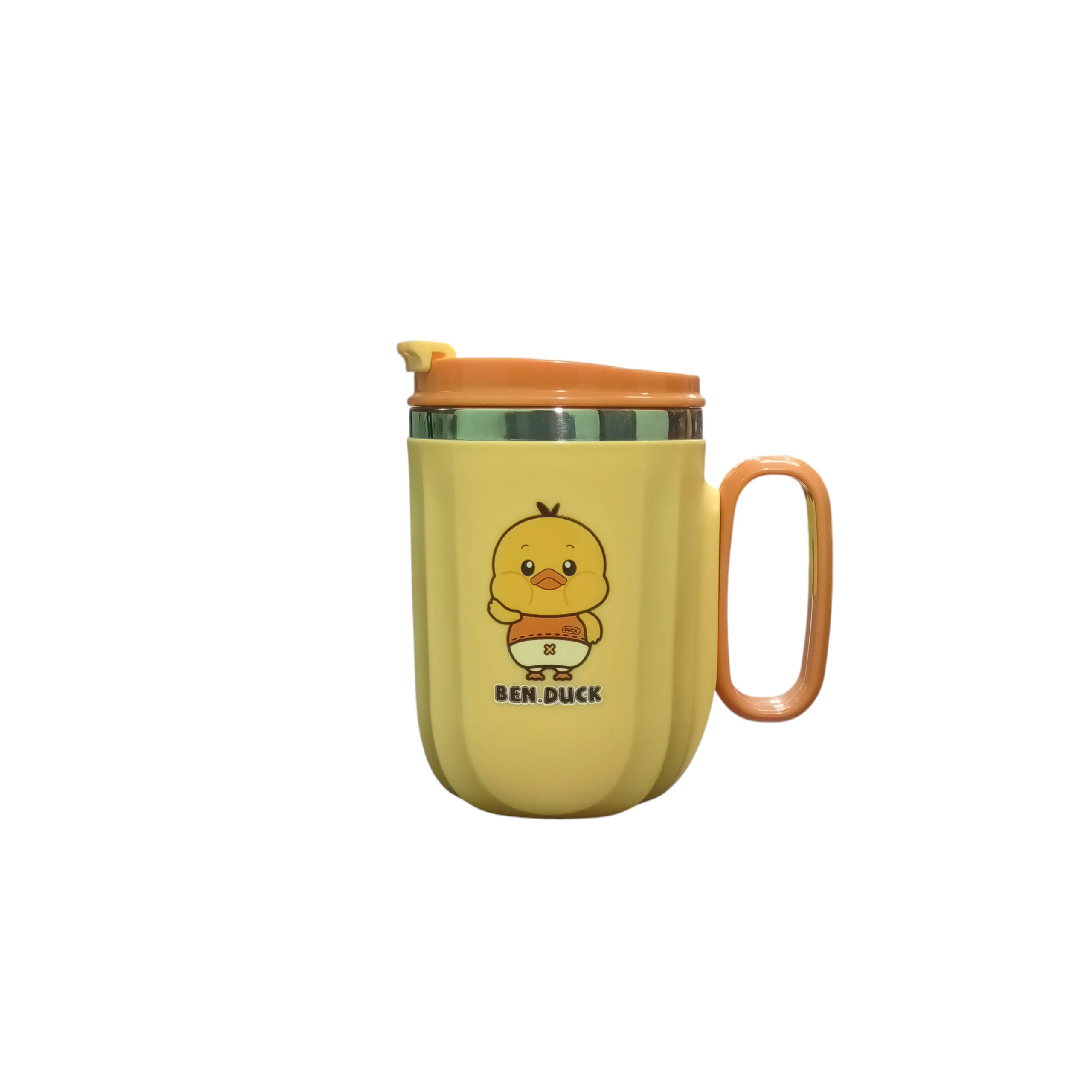 Cute yellow insulated mug with handle and lid, featuring an adorable duck print for kids.