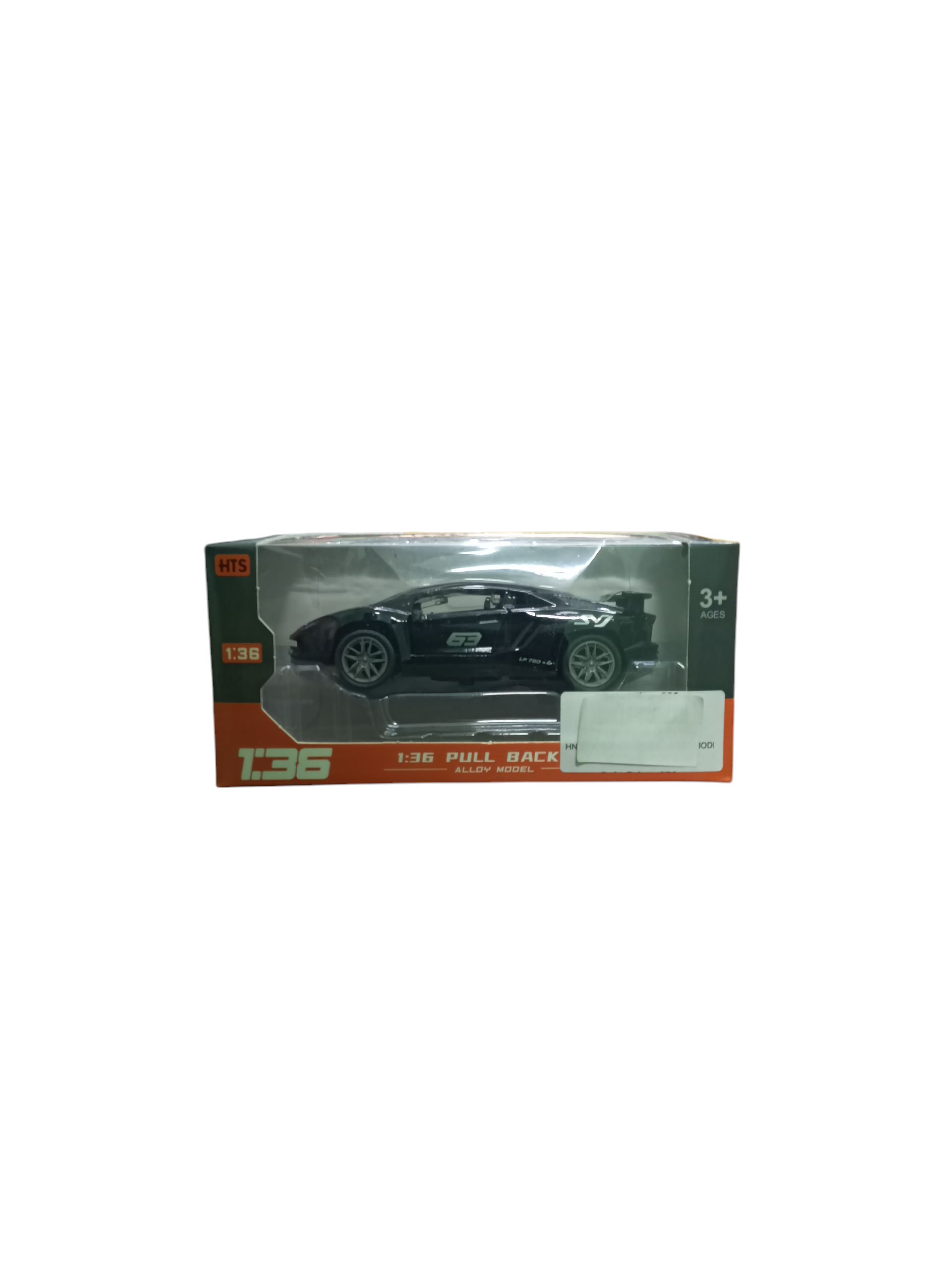 This is a black, 1:36 scale, alloy pull-back model of a sports car with the number 63 on the side. The box indicates it’s suitable for ages 3 and up.