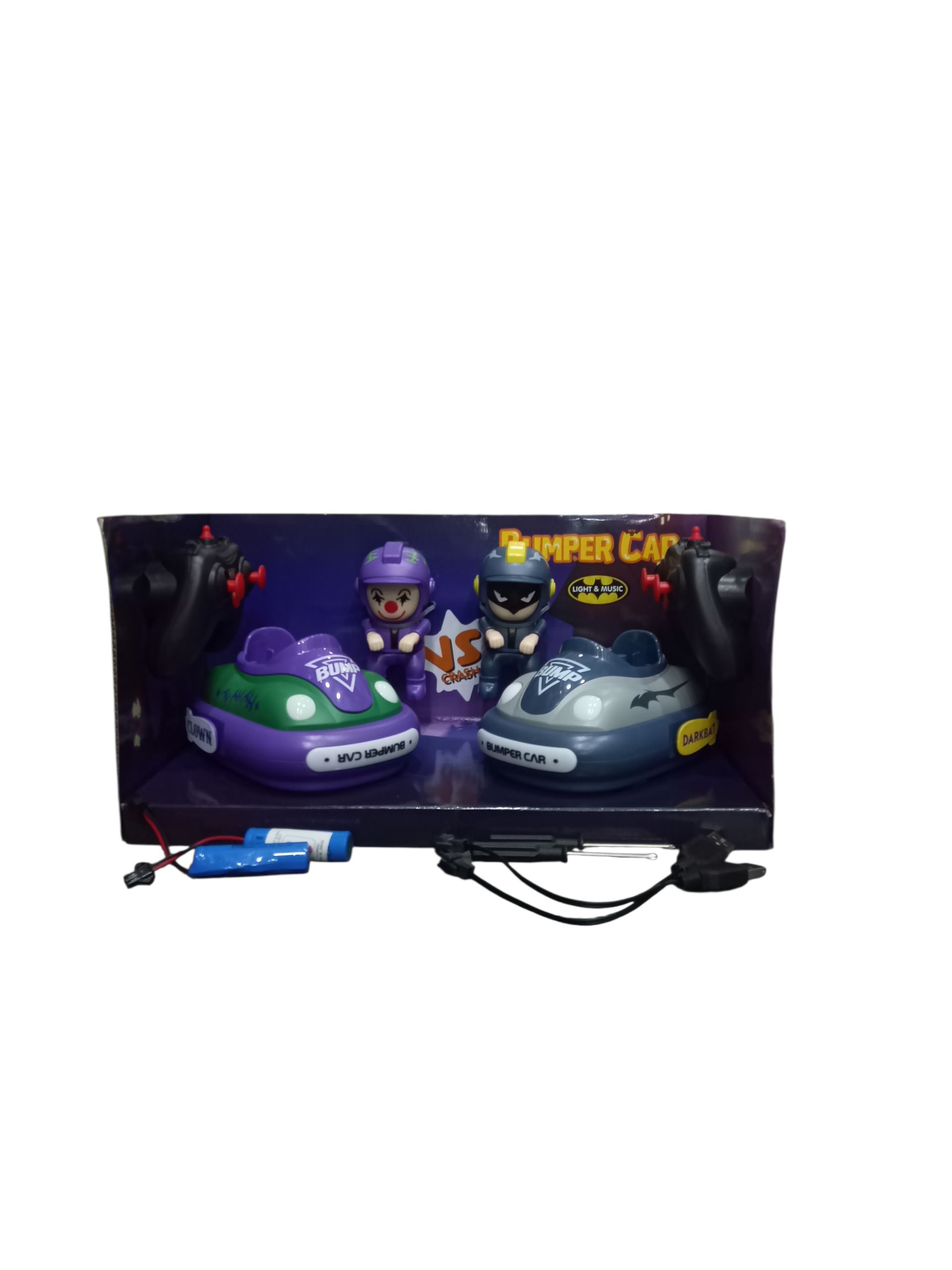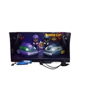 Wireless remote-control bumper car set with two colorful cars and fun characters. Features light, sound, and crash action play. Suitable for kids 3+.