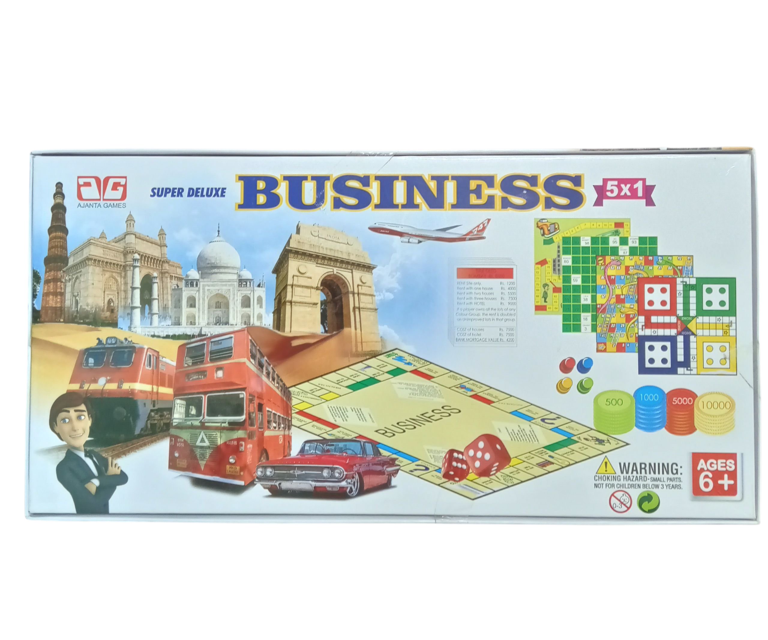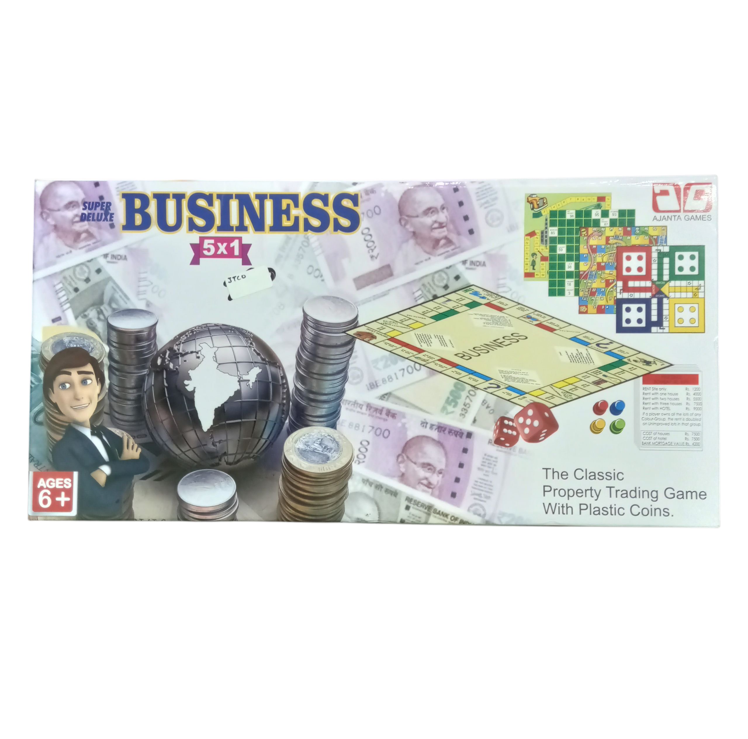 The classic property trading game with 5 exciting games in one pack, featuring Business, Ludo, Snakes & Ladders, and more. Includes plastic coins.