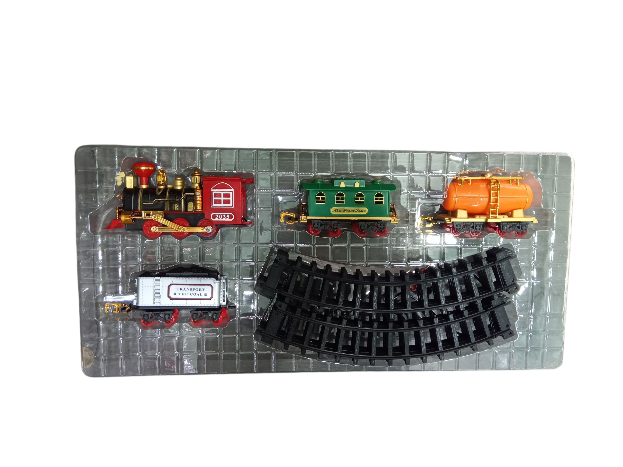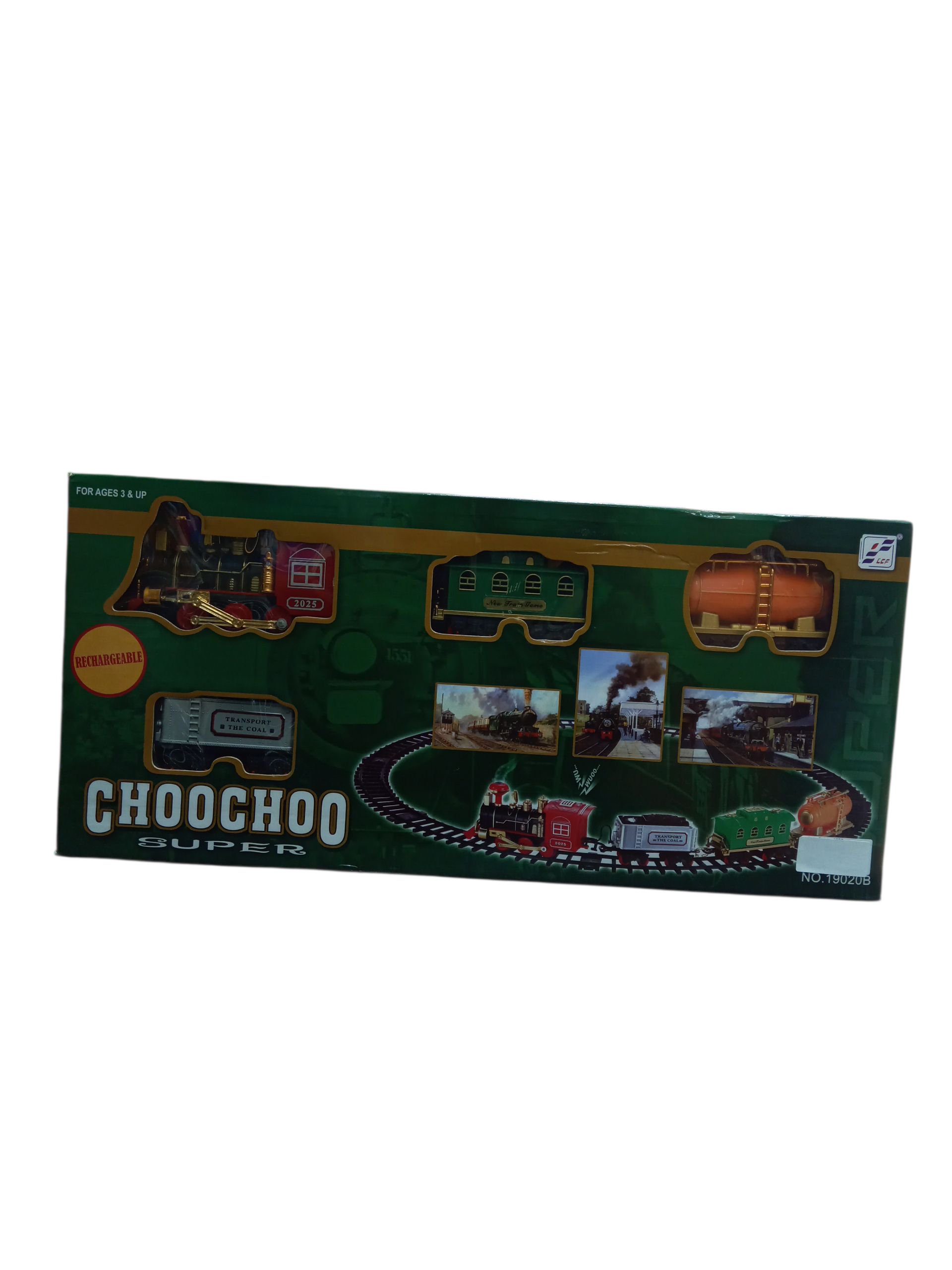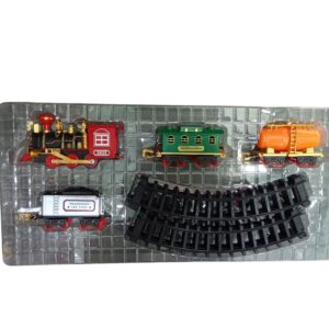 A rechargeable toy train set featuring a locomotive, carriages, and track pieces. Perfect for kids who love trains and imaginative play. Suitable for ages 3 and up.