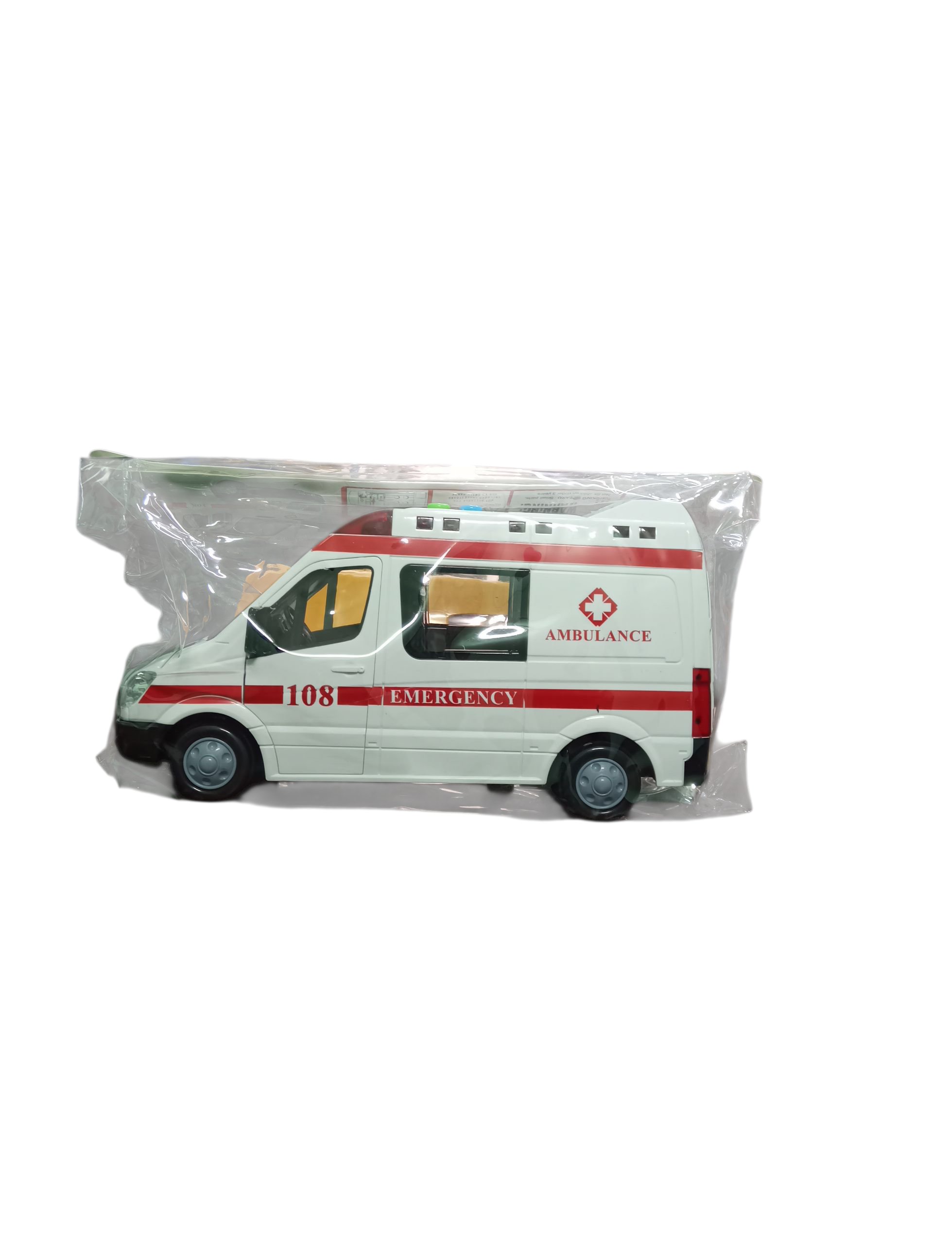 A white and red toy ambulance van packaged in a clear plastic bag. It features a red cross symbol and the text “108,” “EMERGENCY,” and “AMBULANCE.”