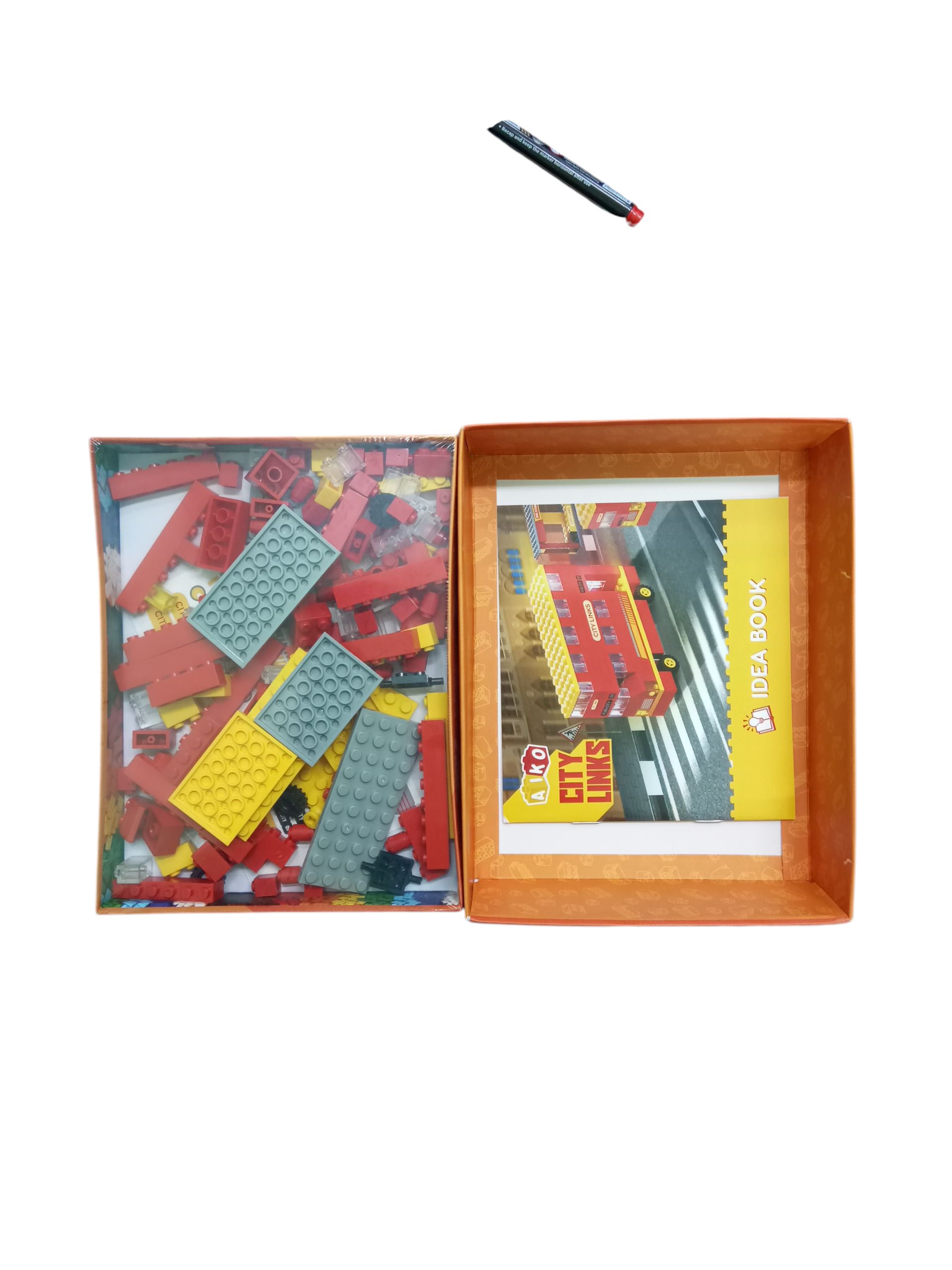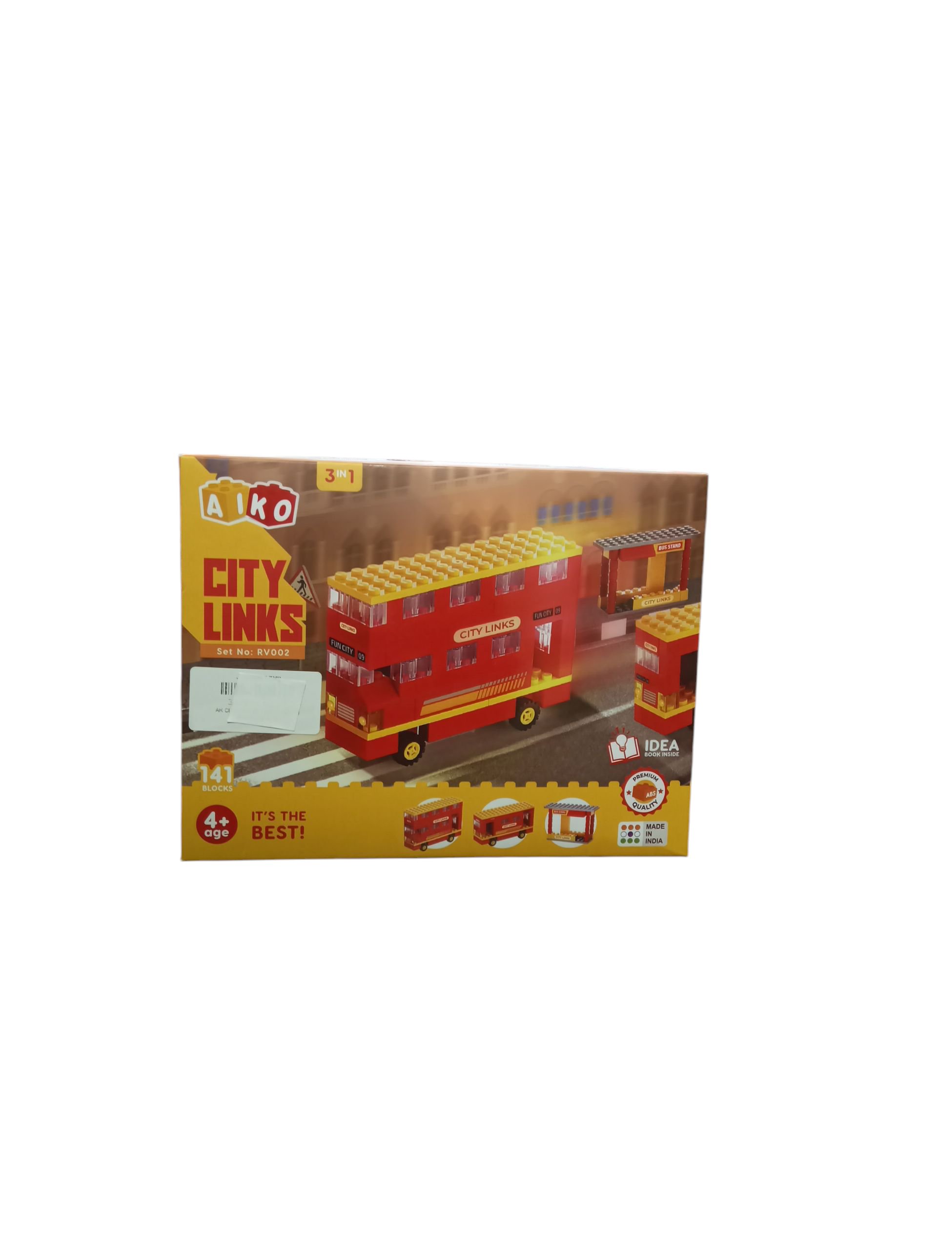 A 141-piece construction set for kids aged 4+, allowing them to build a red double-decker bus and other city structures. Enhances creativity and motor skills.