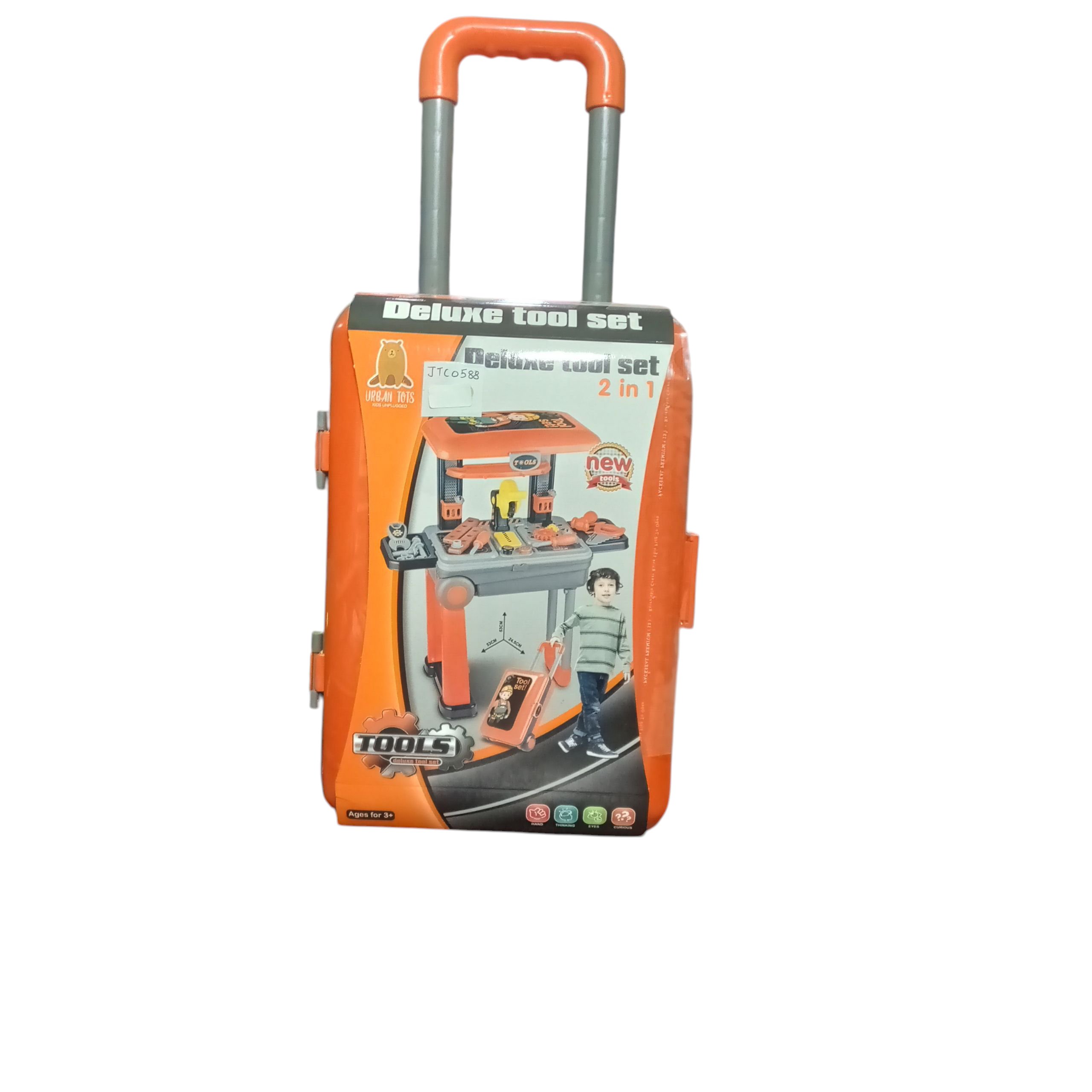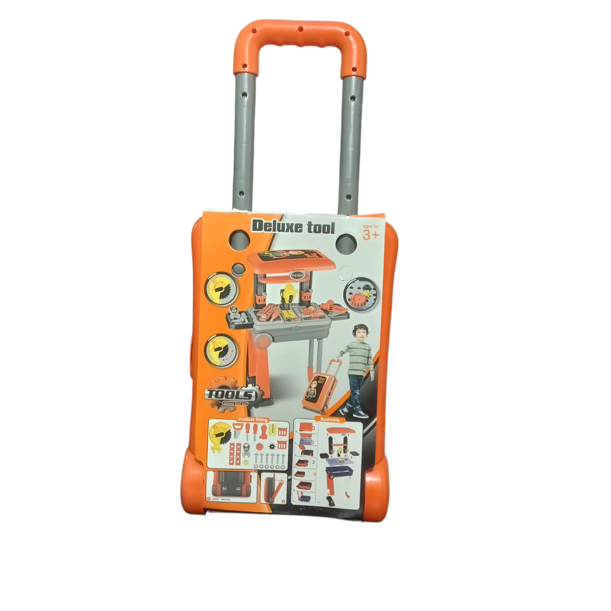 2-in-1 portable tool set with rolling trolley and mini workstation. Comes with realistic tools for pretend play. Age 3+.