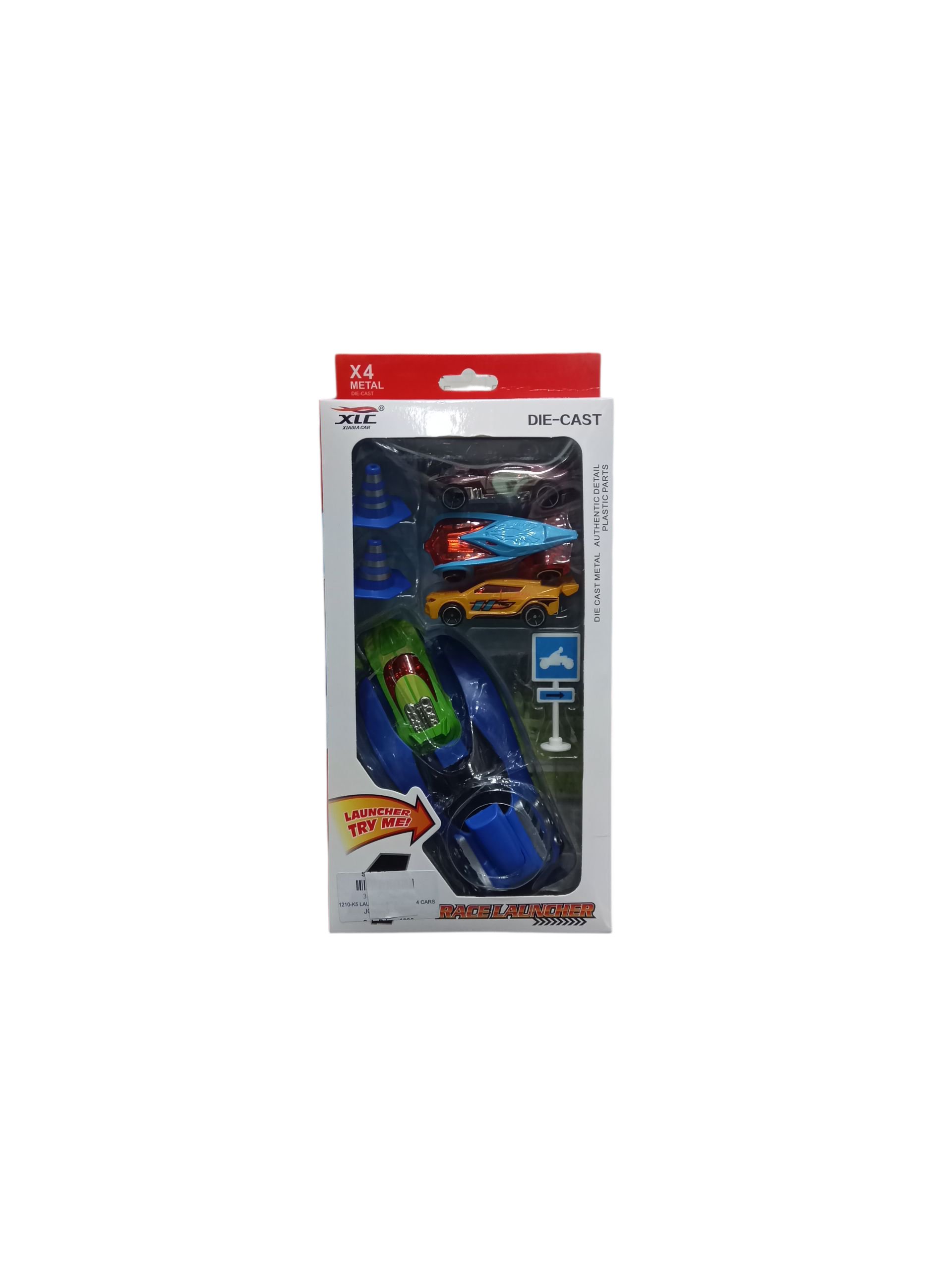 Die-cast metal car set with 4 mini racing cars, traffic cones, and a launcher for fast-paced racing action. Great for car lovers and kids’ racing games.
