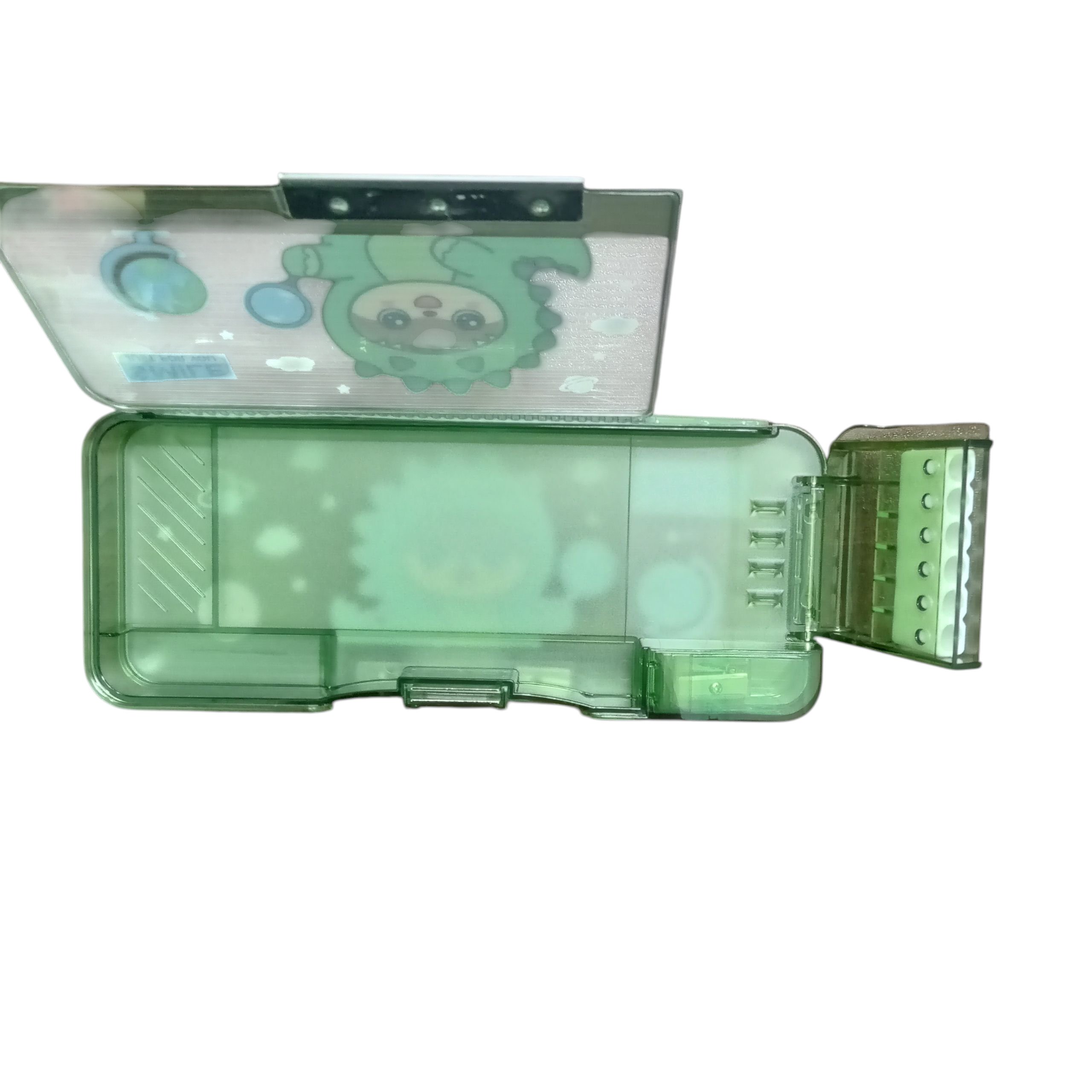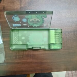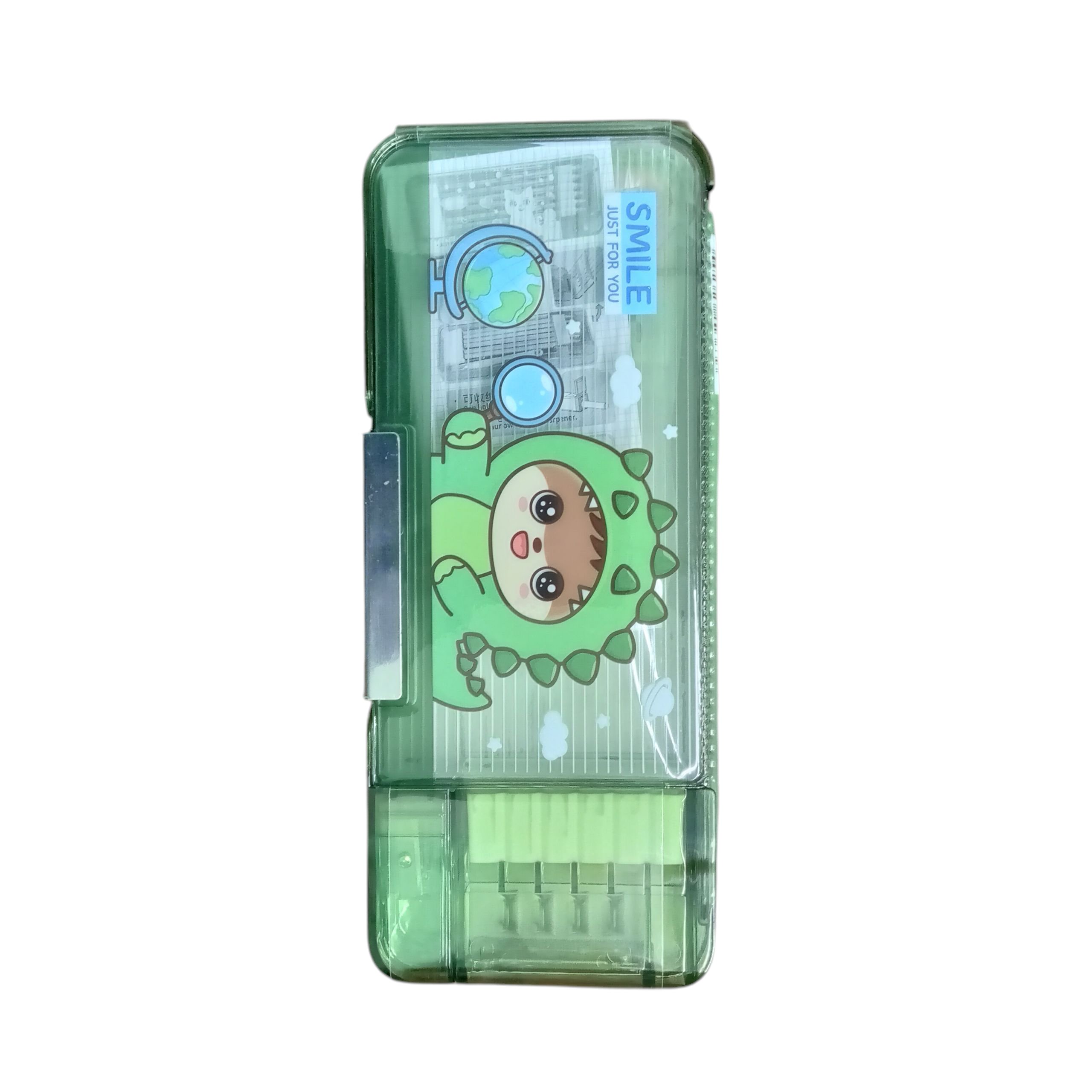 Green dinosaur-themed pencil box with multiple compartments, perfect for keeping pencils and supplies neatly arranged.