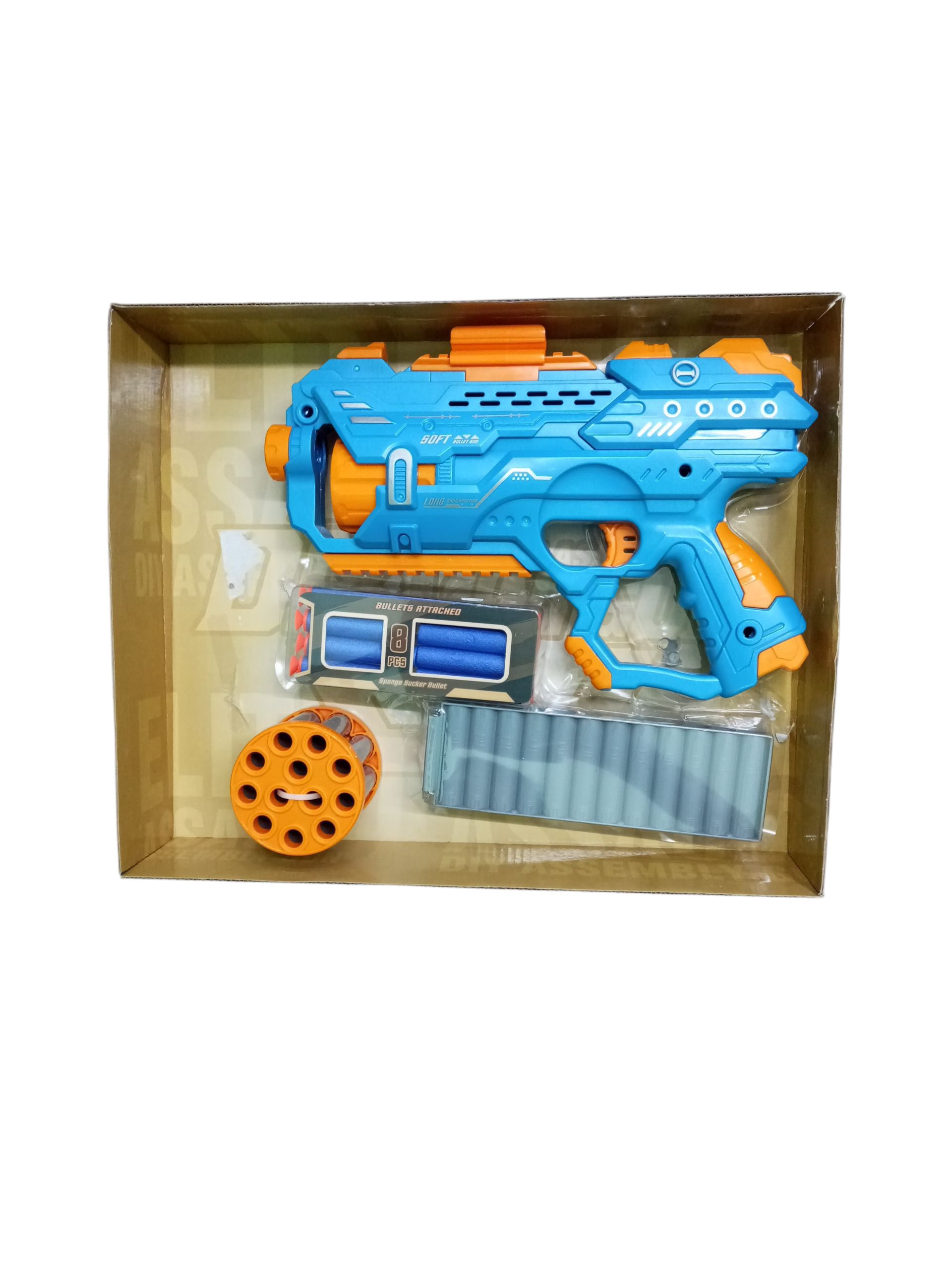 A blue and orange toy blaster with soft foam darts, designed for kids 6+. It comes with assembly parts for a fun DIY experience.