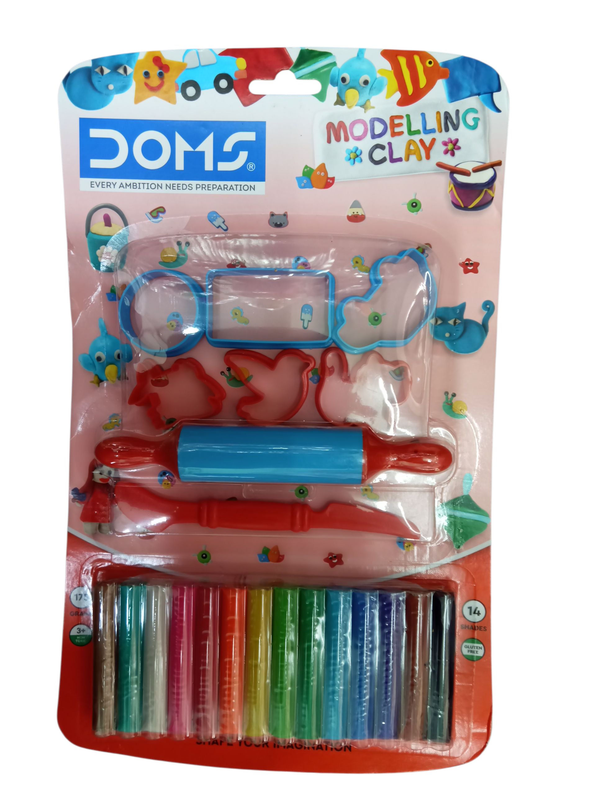 A set of 14 different shades of modelling clay (175 grams total) that is non-toxic and gluten-free, packaged with sculpting and shaping tools like a roller, cutters, and a small spatula/knife.
