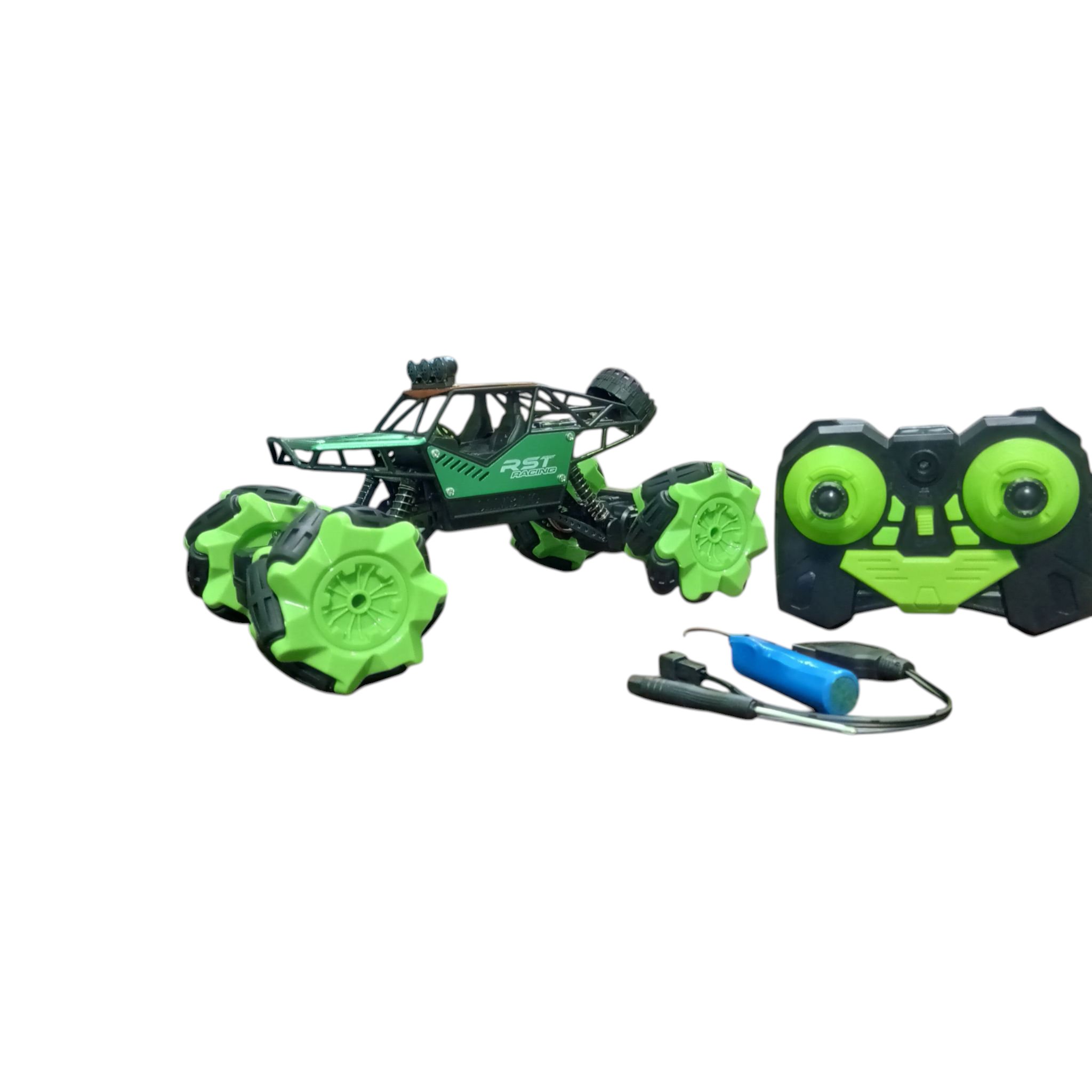 High-speed remote control stunt car with 360° rotation, side drifting, and off-road grip wheels. Comes with rechargeable battery and dual-joystick controller for smooth multi-directional control. Perfect for thrilling racing and stunt action indoors or outdoors.