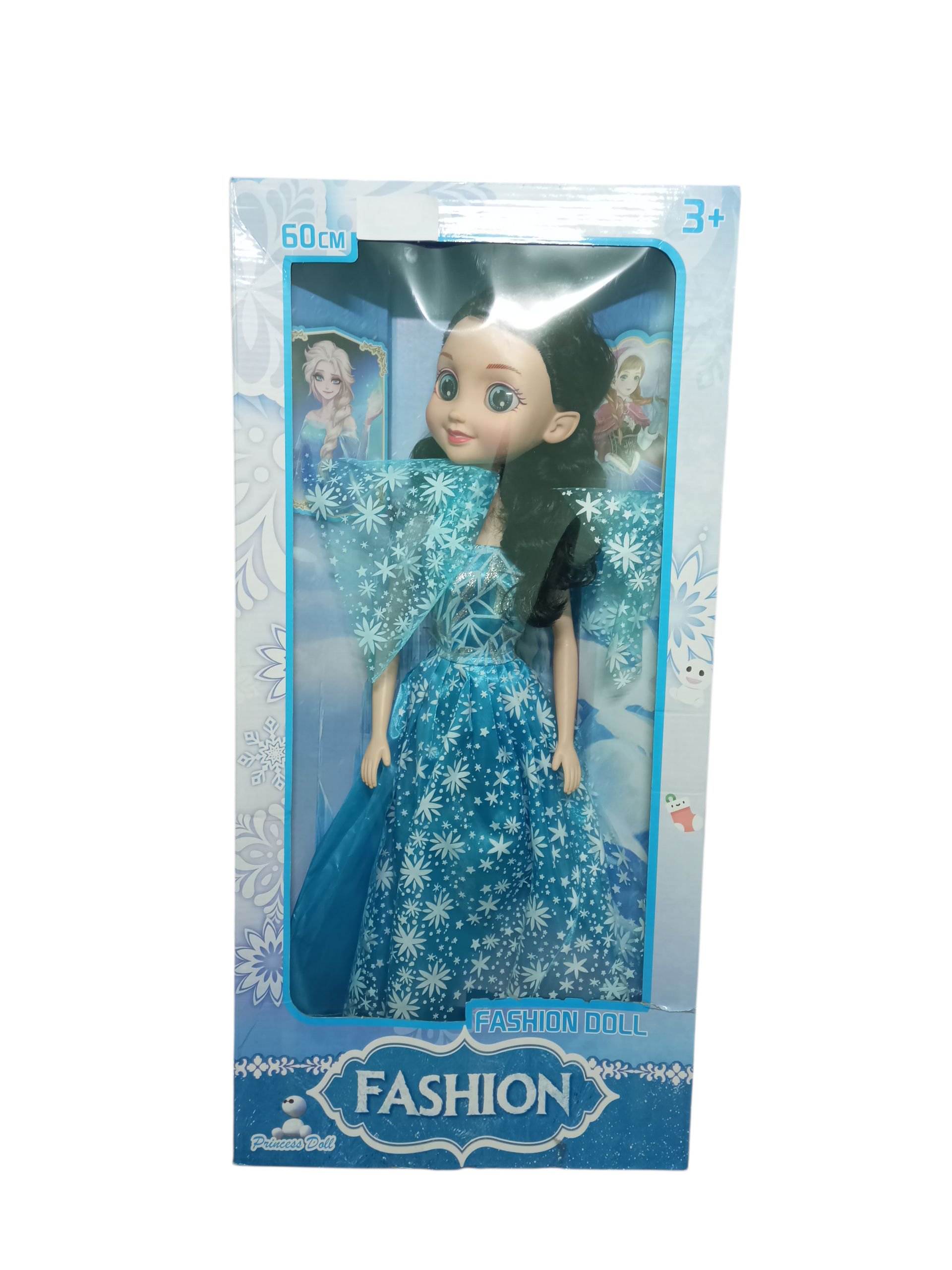 This is a large fashion doll that appears to be inspired by characters from the movie Frozen (Elsa and Anna-like images are visible on the box). The doll is wearing a long, blue dress with a snowflake pattern and a sheer, matching wrap. The doll is approximately 60 cm tall (as indicated on the box) and is suggested for ages 3+.