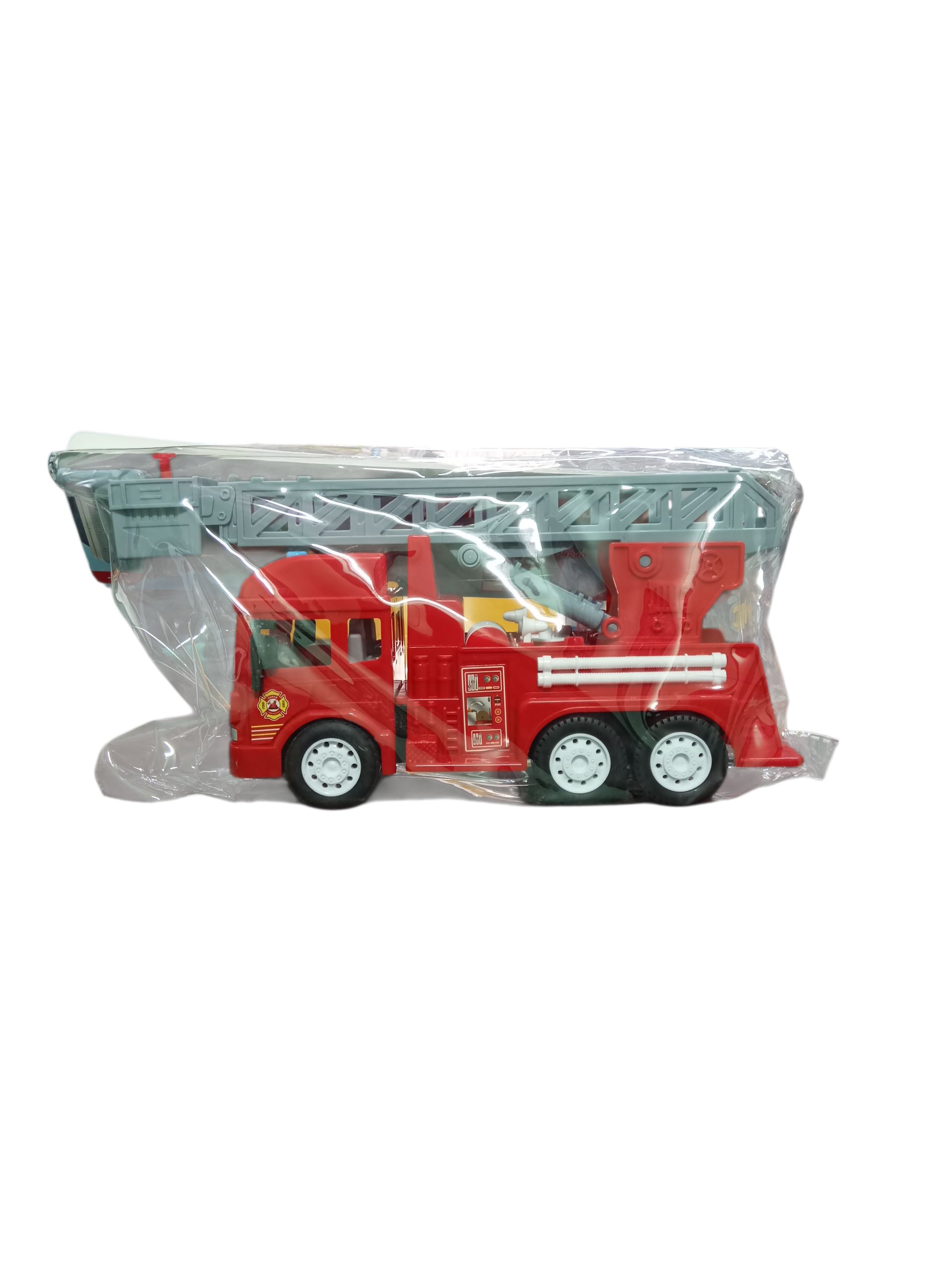 A red plastic fire truck with an extendable ladder, designed for kids to enjoy role-playing as firefighters. Durable and fun for ages 3+.