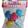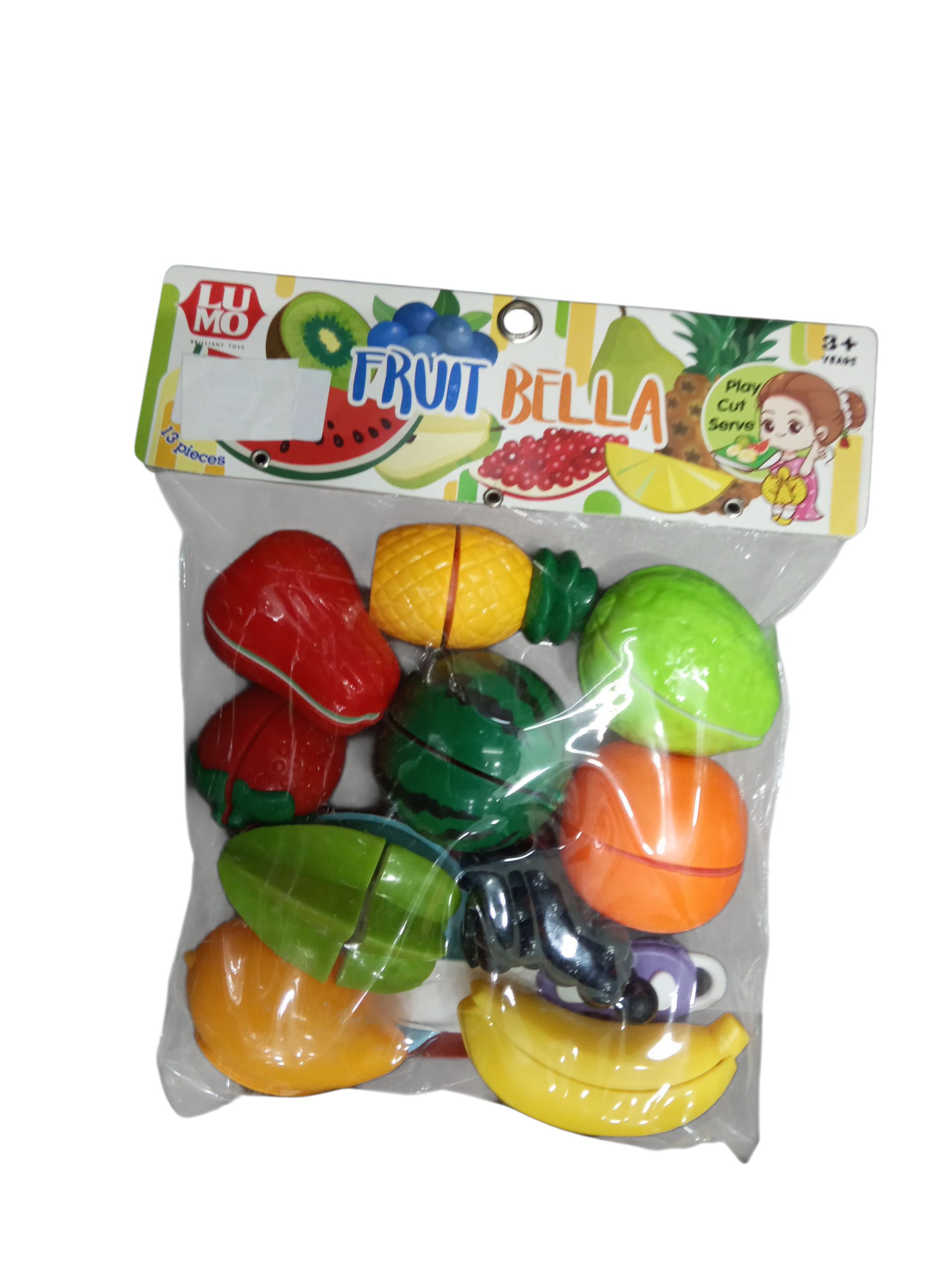 A blister-packed set of plastic, simulated cutting fruit toys. The set includes pieces like grapes, watermelon, and lemon, along with a small cutting board and a play knife for imaginative kitchen play. The packaging is labeled “FUN! Family” and “SIMULATED FOOD.”