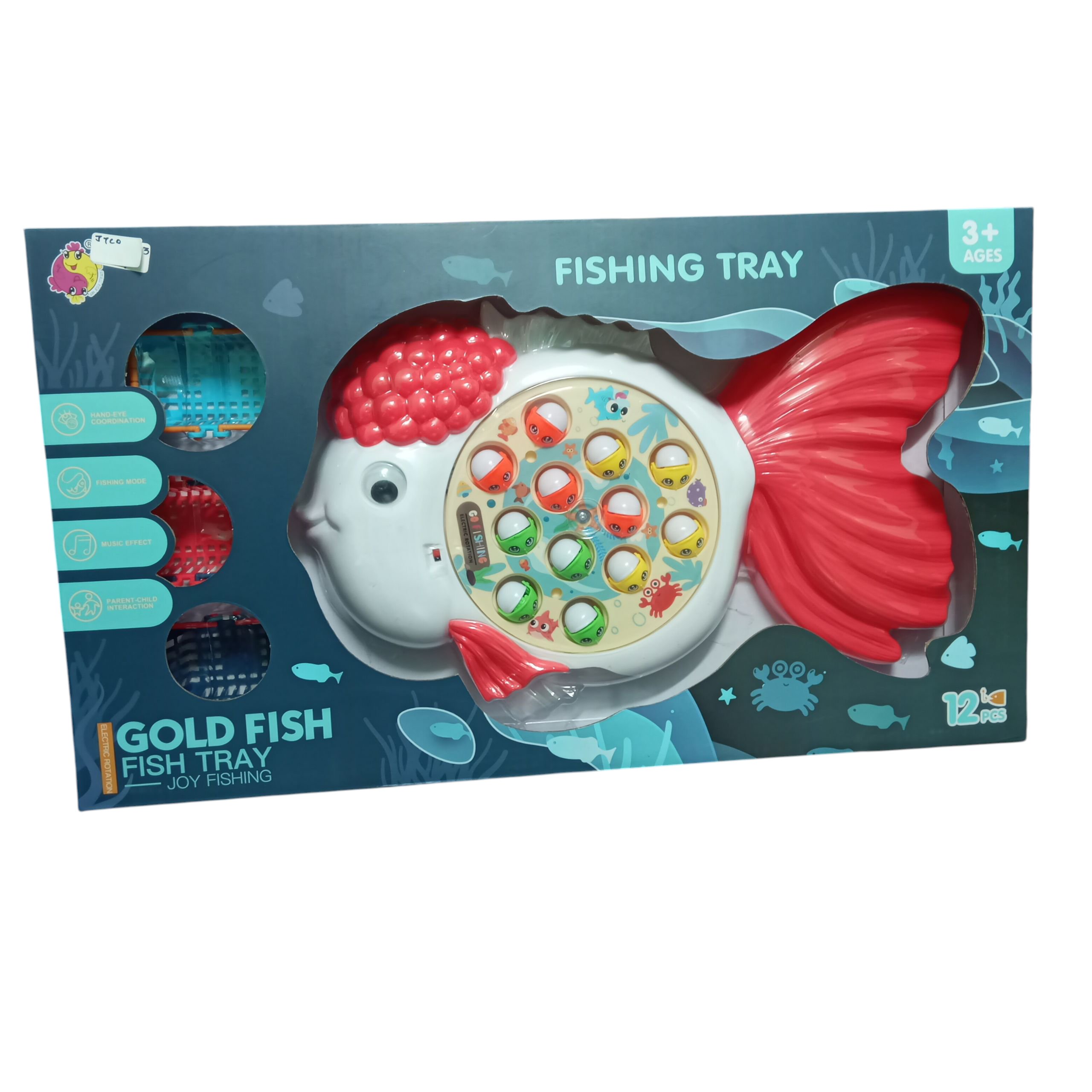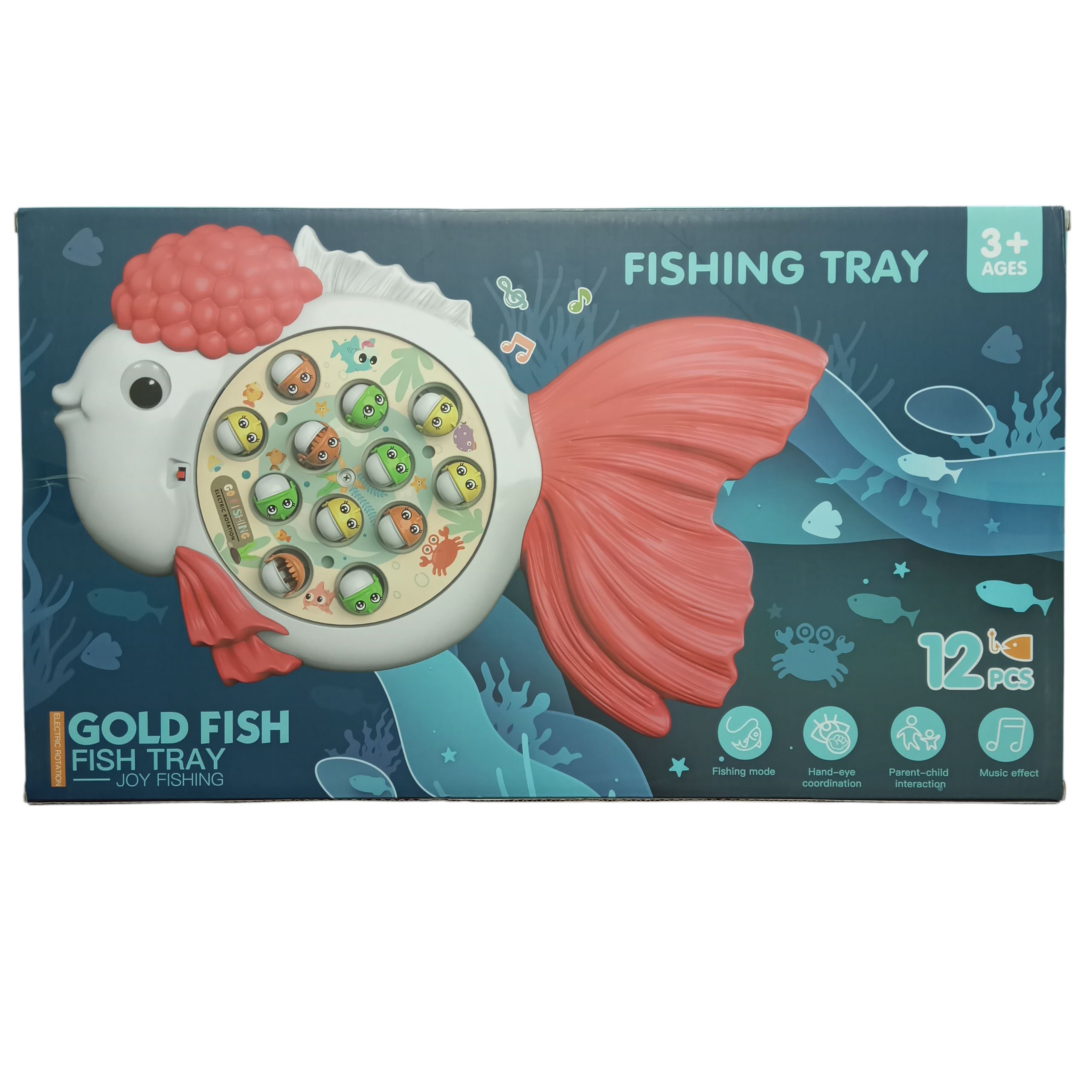 Fun rotating fishing game shaped like a goldfish. Includes 12 colorful fish, music effects, and enhances hand-eye coordination. Ideal for 3+ years.