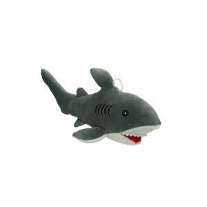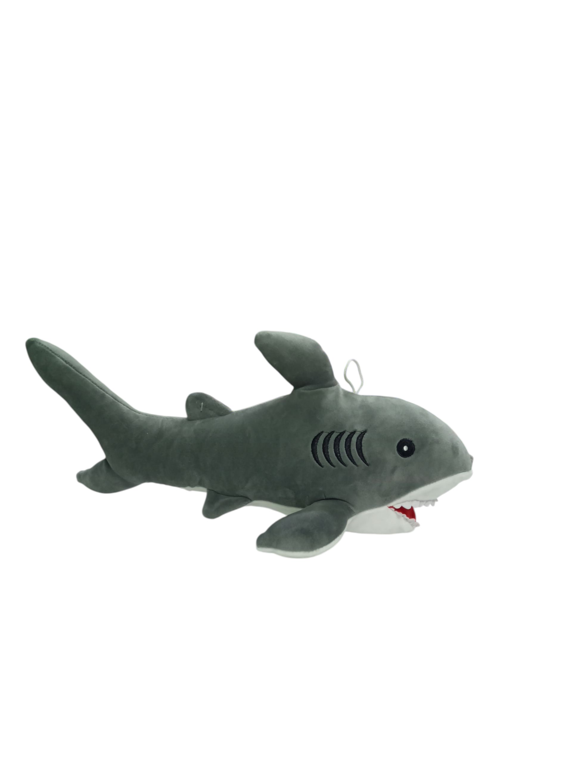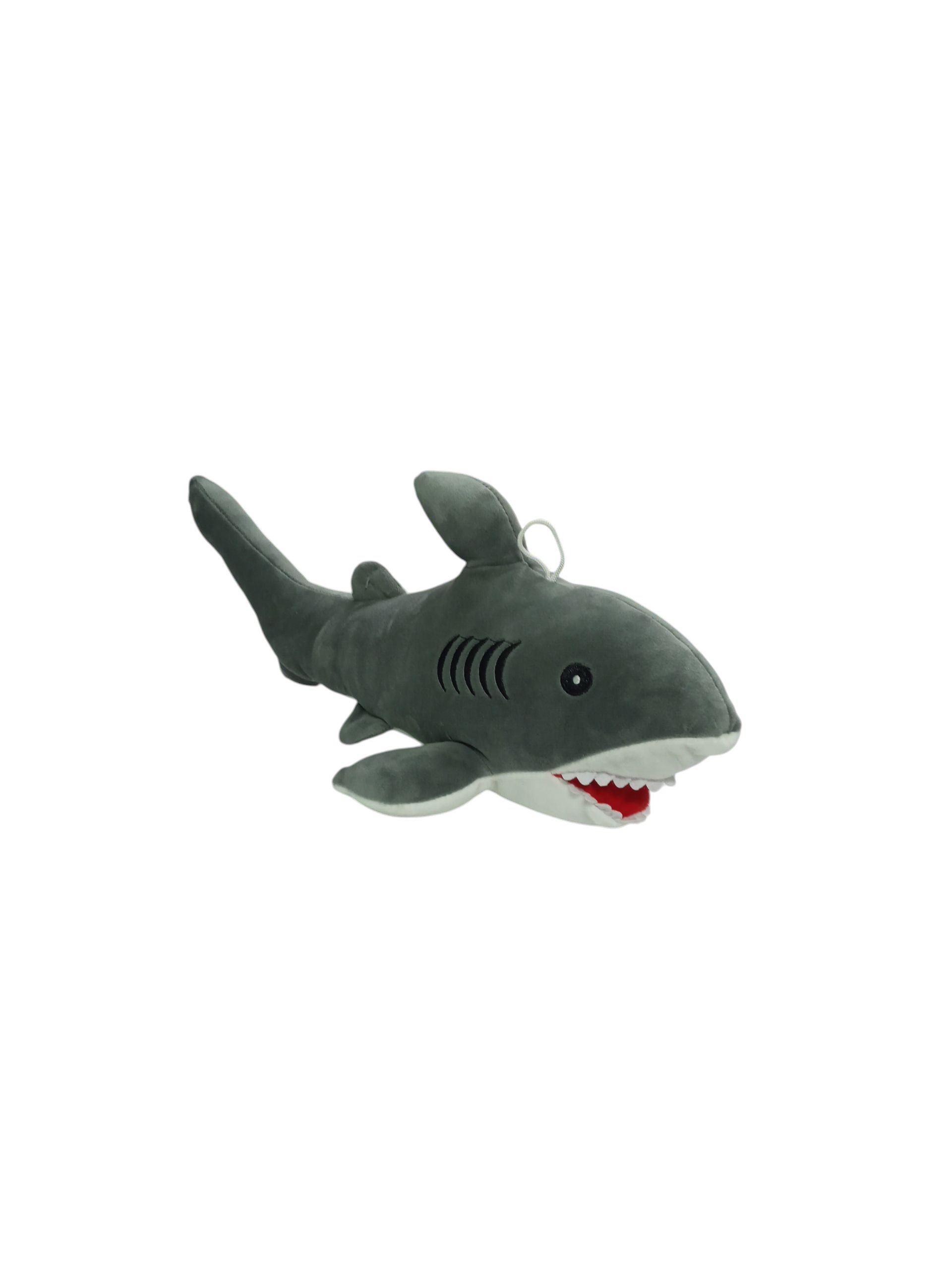 A plush toy shark with a dark grey body, a white underbelly, and stitched gills on its side. It has a small open mouth showing red inside.