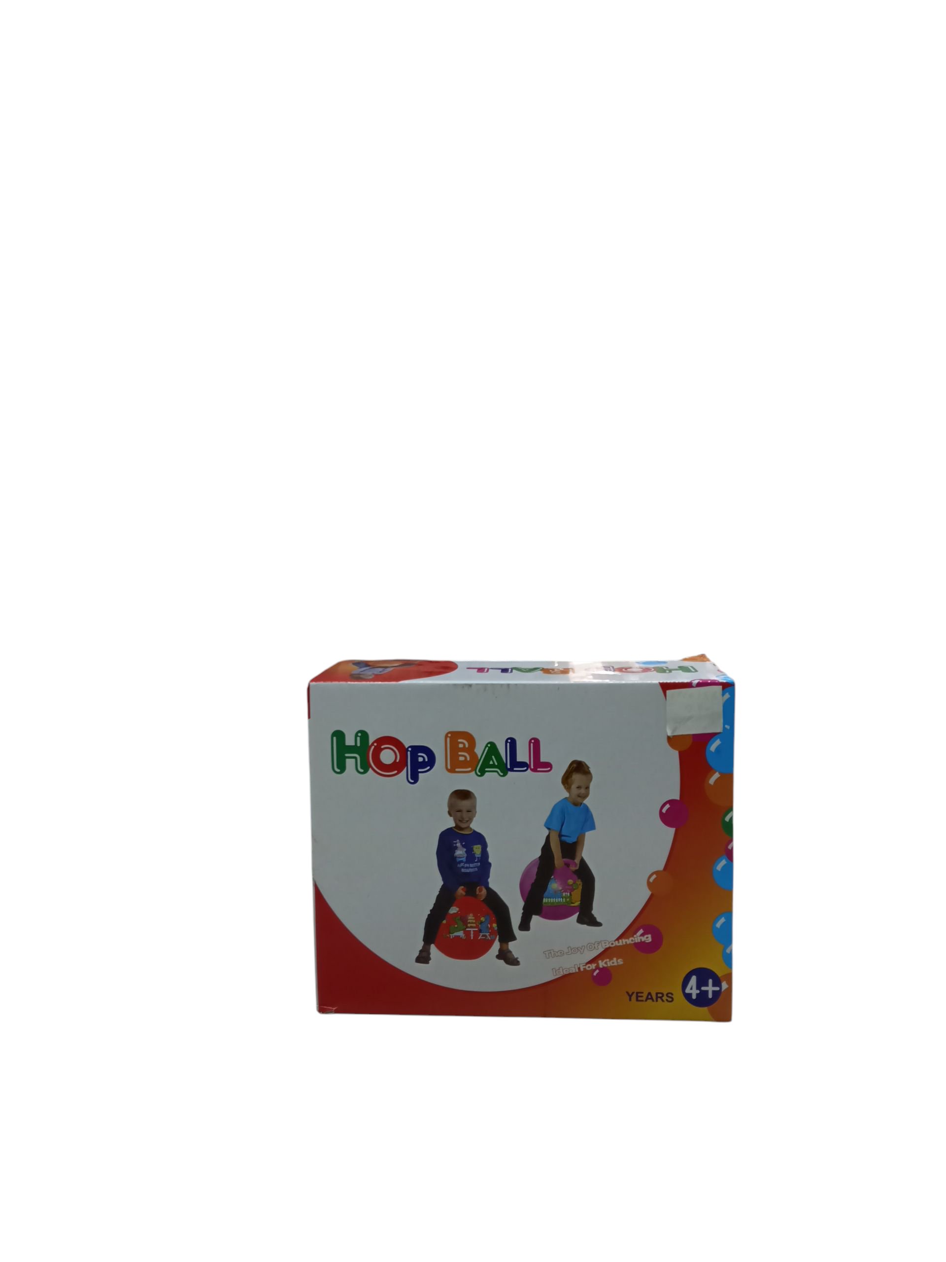This is an inflatable hop ball, also known as a hopper ball or jumping ball. The box shows two children sitting on them, which demonstrates how the toy is used for bouncing and jumping. This type of toy is used to promote balance and coordination.