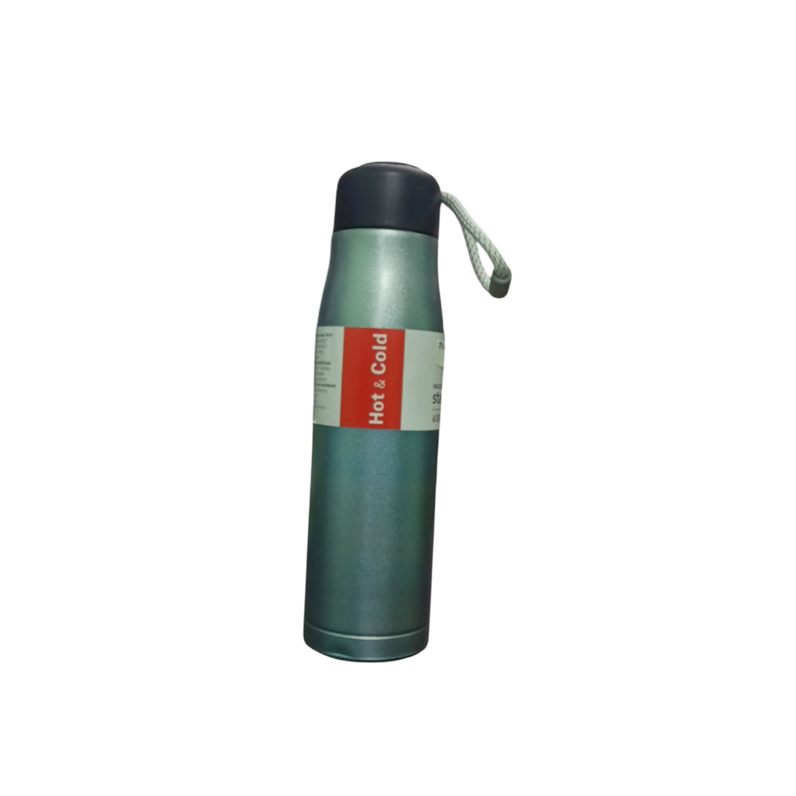Insulated stainless steel flask with carry strap, keeps beverages hot or cold for hours.