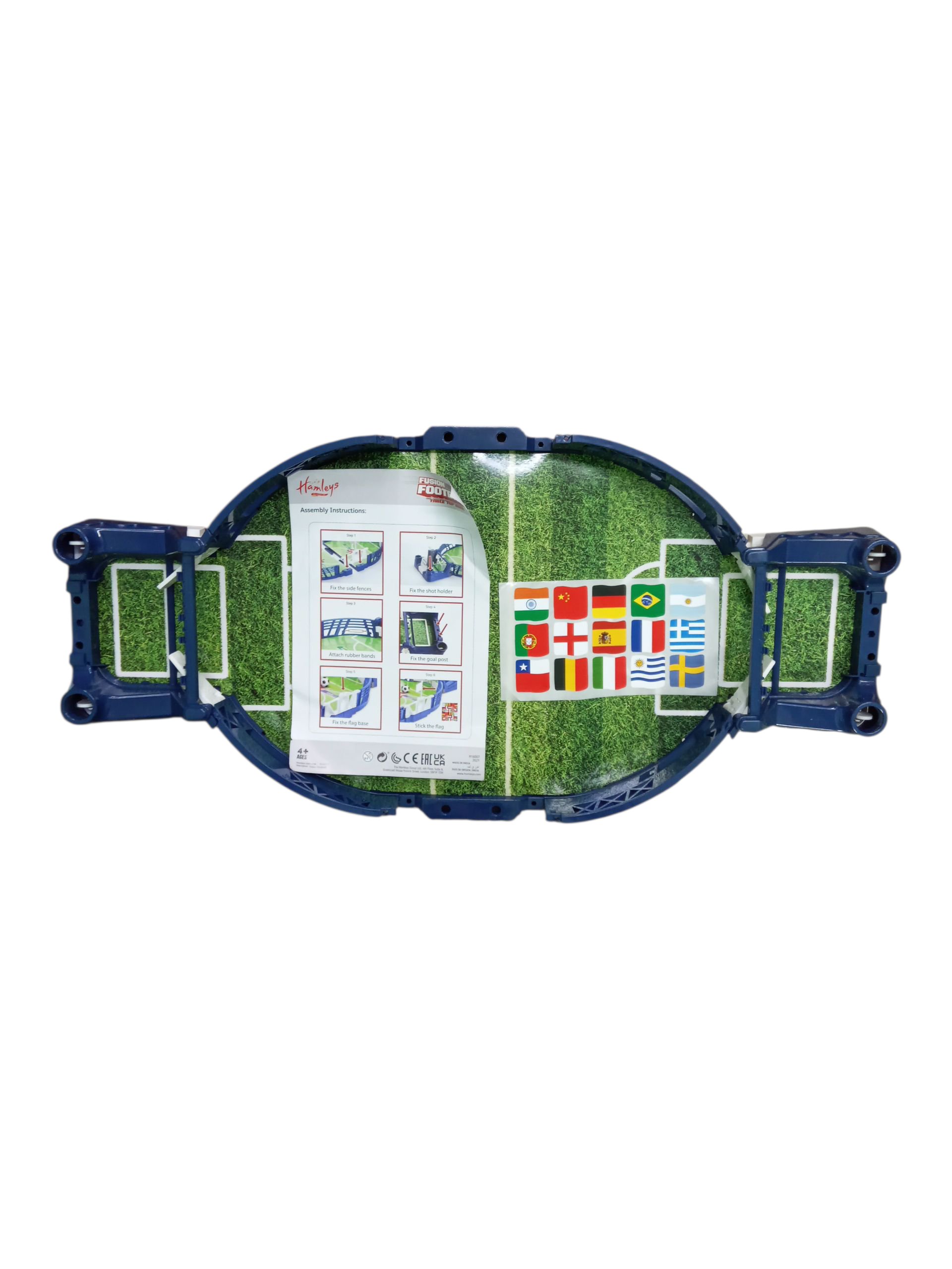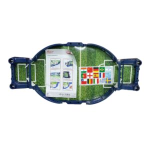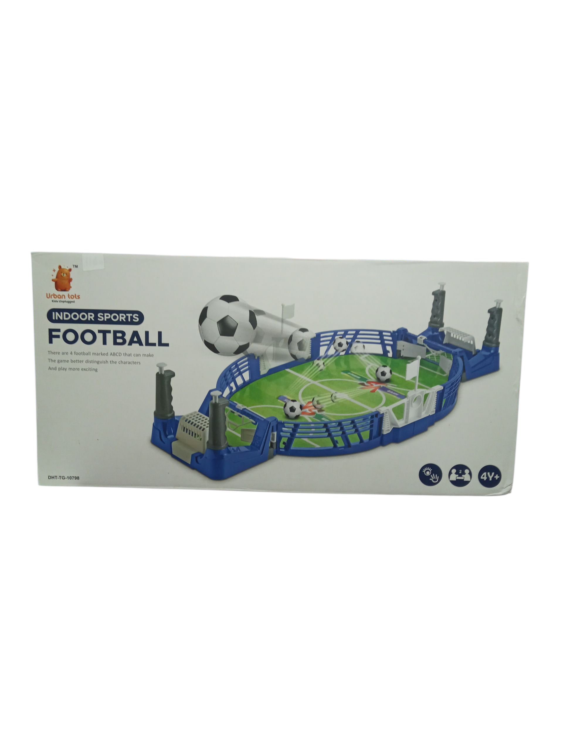 This is a compact, tabletop football (soccer) game designed for indoor play. The box art shows a miniature field with blue plastic sides and manual controls (likely levers or triggers) for players to move the figures or manipulate the ball. It is branded “Urban Toys” and suggests “4V+” as an age rating. It’s a type of mini foosball or flipper football game.
