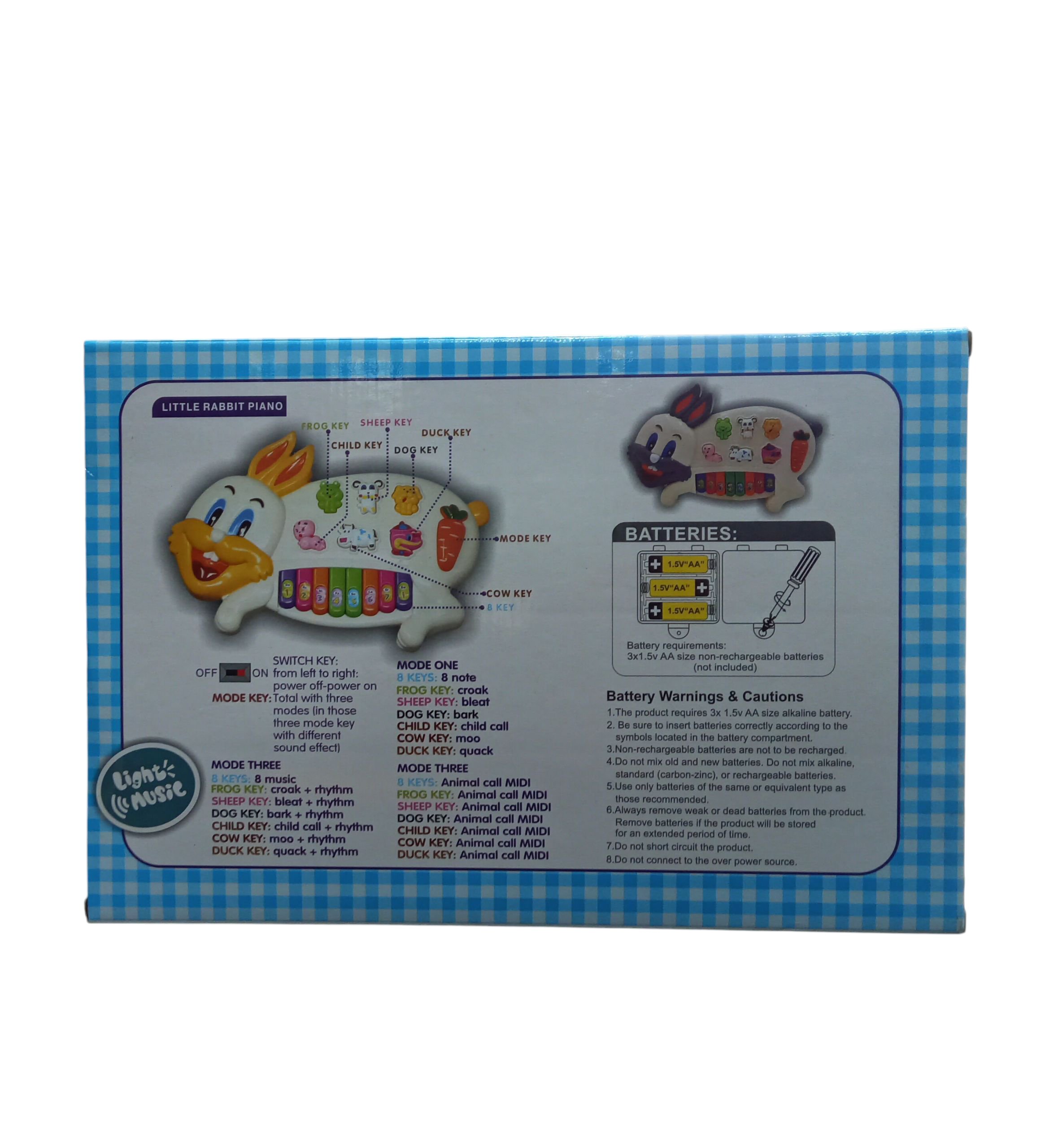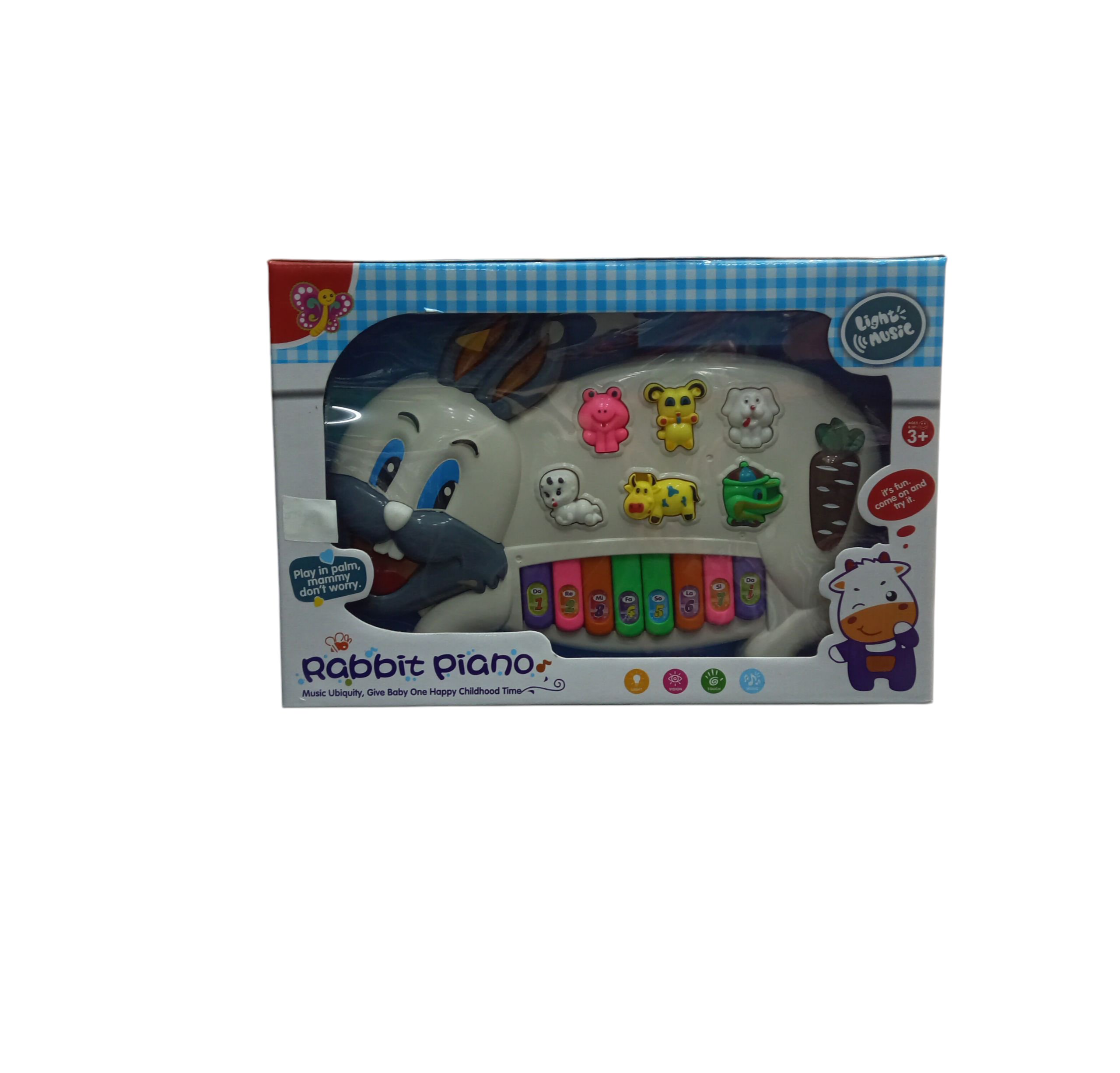 A multifunctional rabbit-shaped piano with light and music. Features animal sounds, melodies, and educational keys, encouraging musical learning and imaginative play for kids.