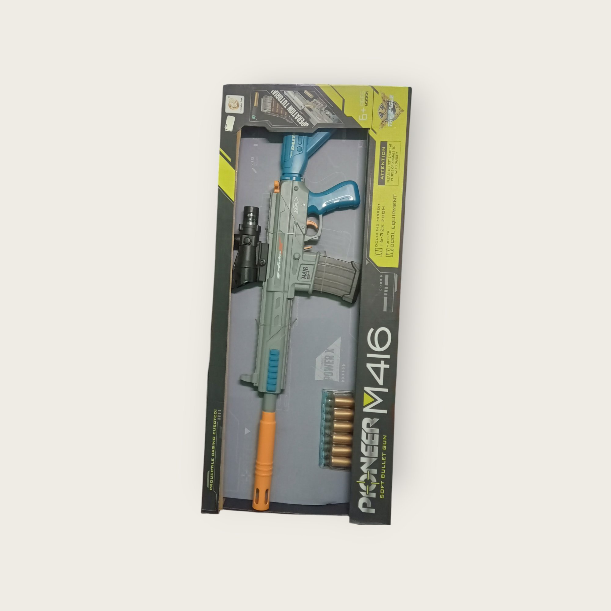 Get ready for action with the Pioneer M416 Soft Bullet Gun! This toy rifle comes with a realistic design, soft bullets for safe play, and a cool scope for added fun. Perfect for kids 6+ who love adventure and role-play. Durable, stylish, and safe – a great gift for young heroes!