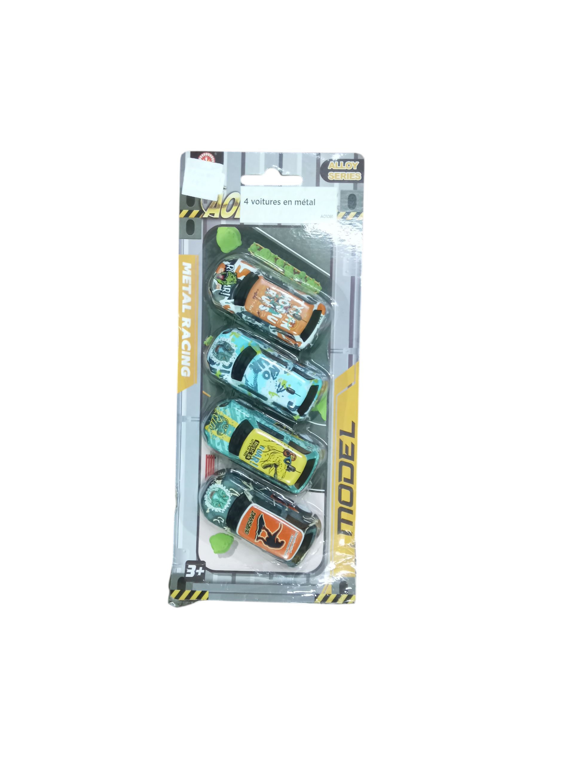 A pack of four metal alloy cars with unique prints, designed for racing and enhancing imaginative play in children aged 3+.