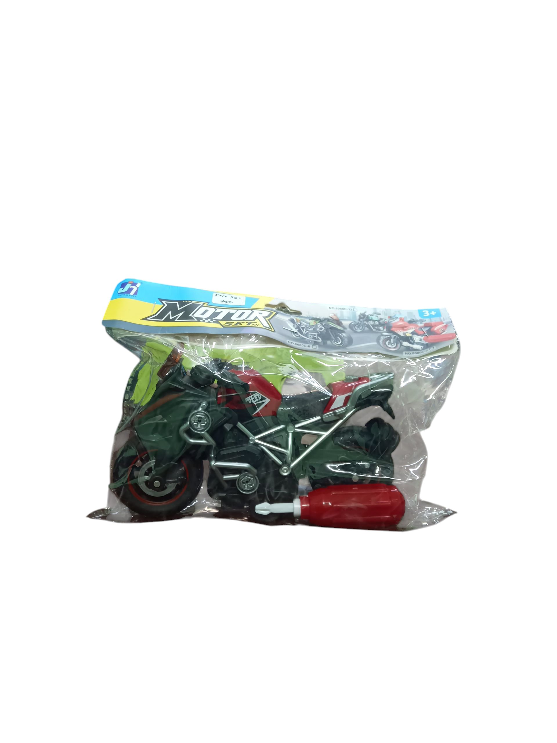 This product is a motorcycle toy that comes with a small red and black motorcycle and a red screwdriver. The toy is packaged in a clear plastic bag with a colorful header. The inclusion of a screwdriver suggests it might be a build-it-yourself or take-apart toy, and the packaging indicates it is for children aged 3 and up.