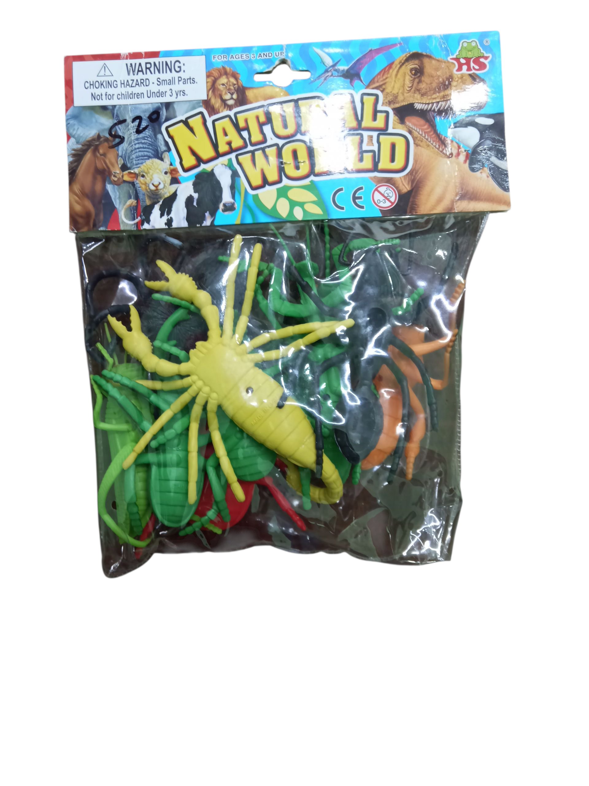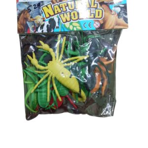 A set of plastic toy figures of various insects and bugs (e.g., ladybug, grasshopper).