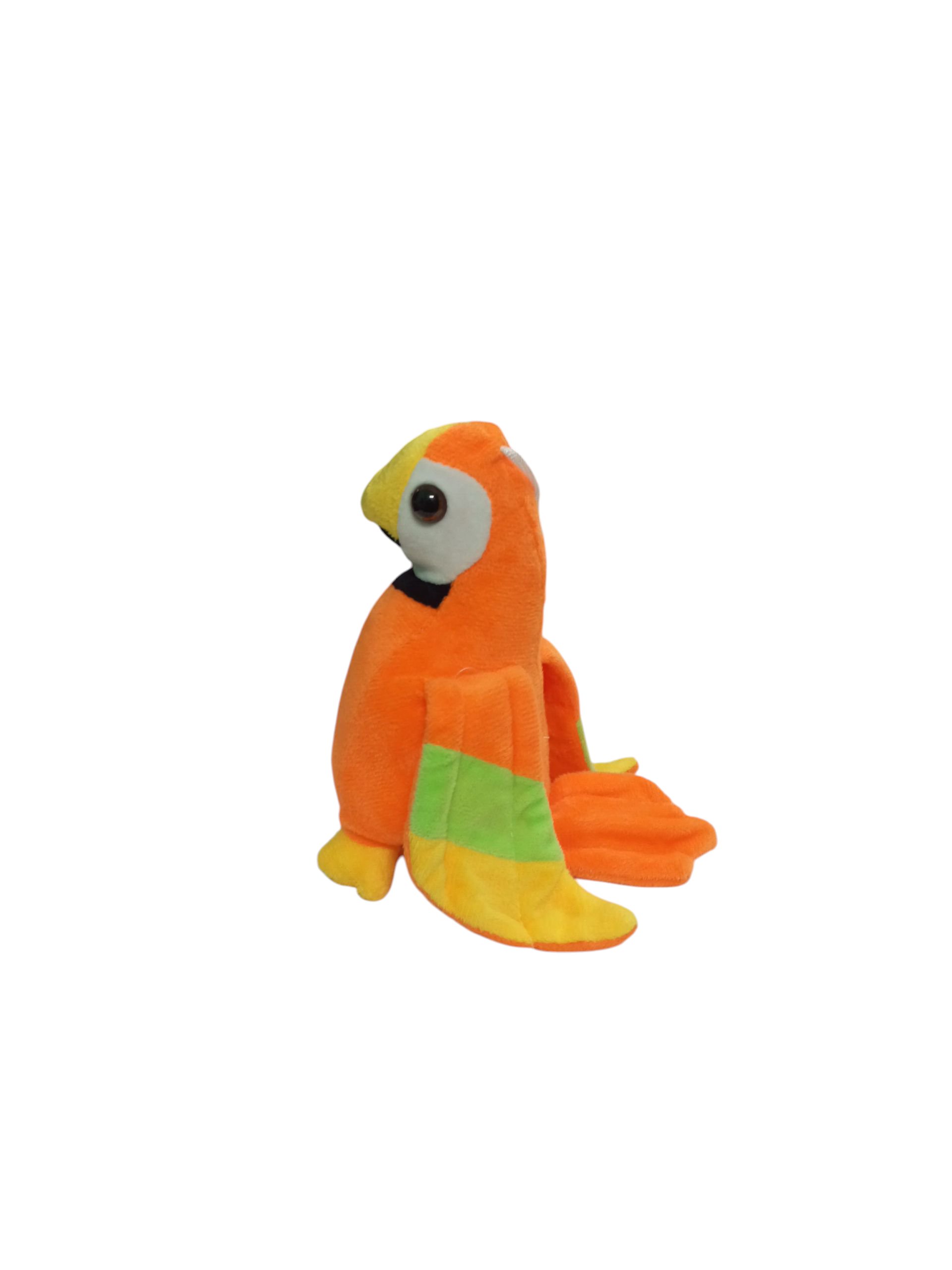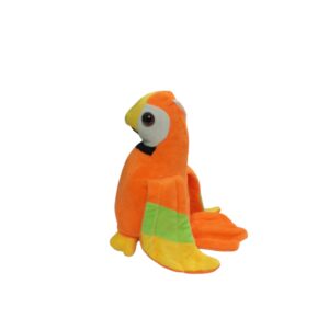 This is a plush toy parrot with a bright orange body, a yellow beak, and green and yellow stripes on its wings.