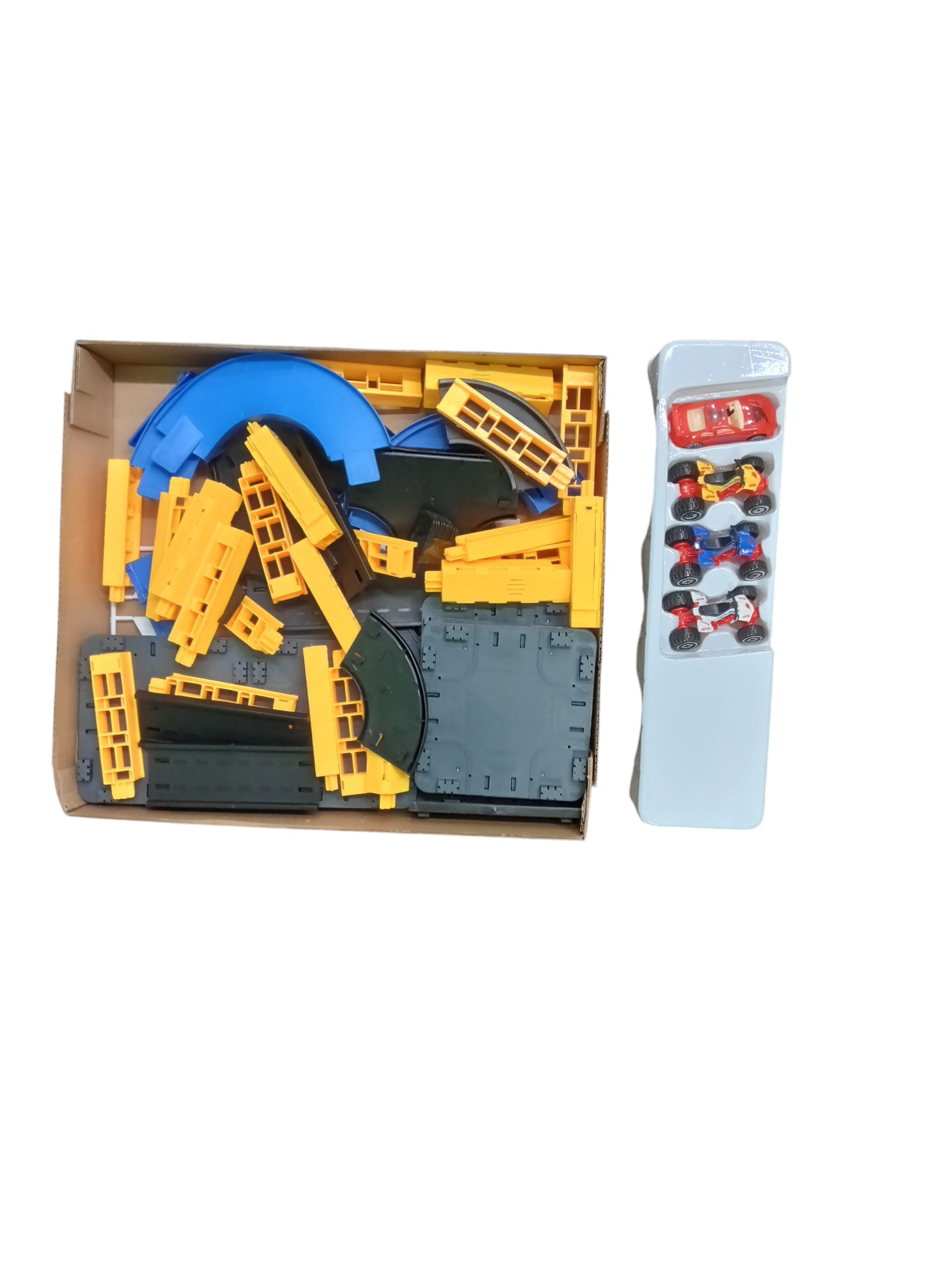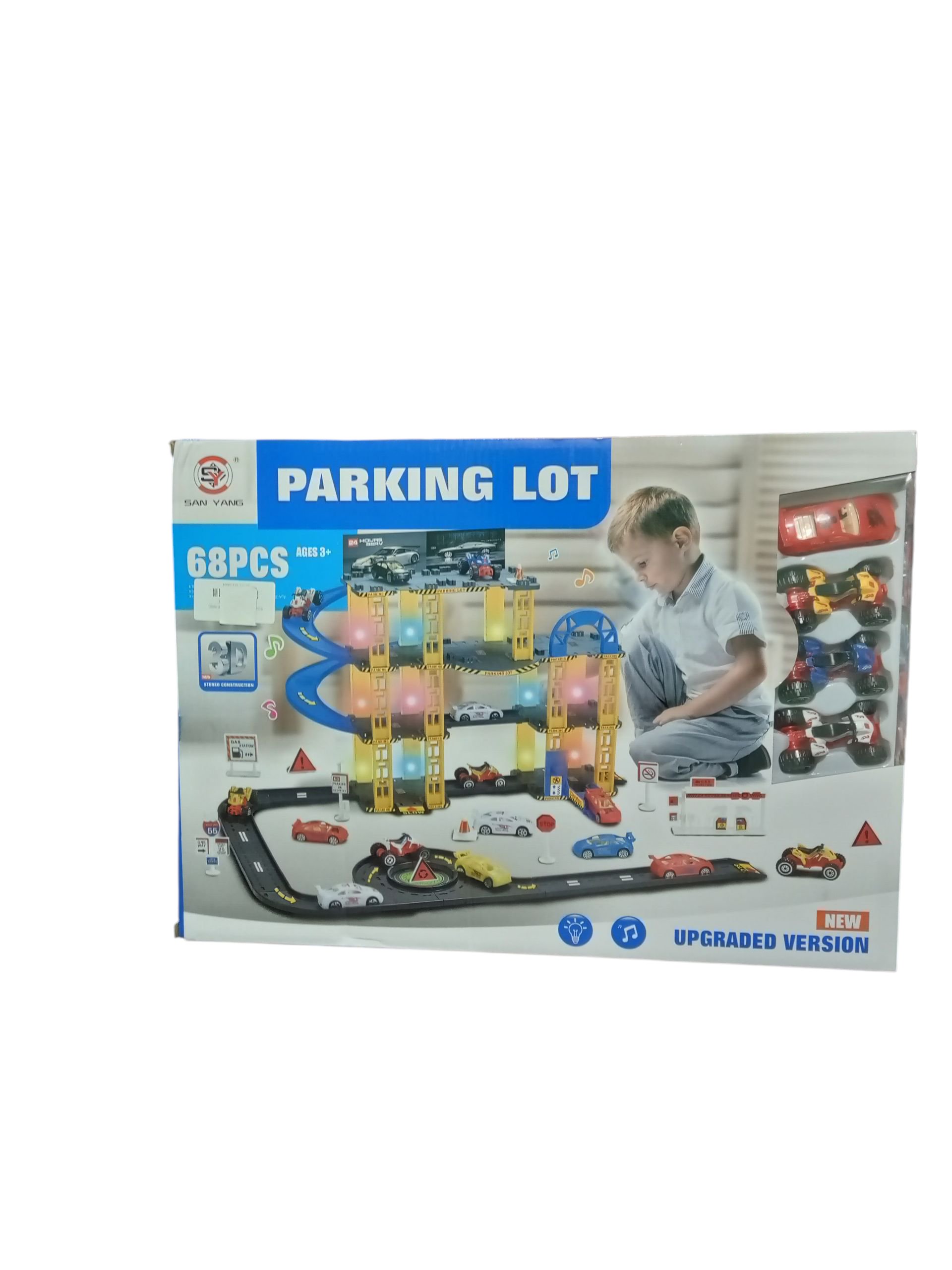 A multi-level toy parking garage set with ramps, roads, and assorted toy cars and trucks. The box shows that it’s an “upgraded version” with 68 pieces and is suitable for ages 3 and up.