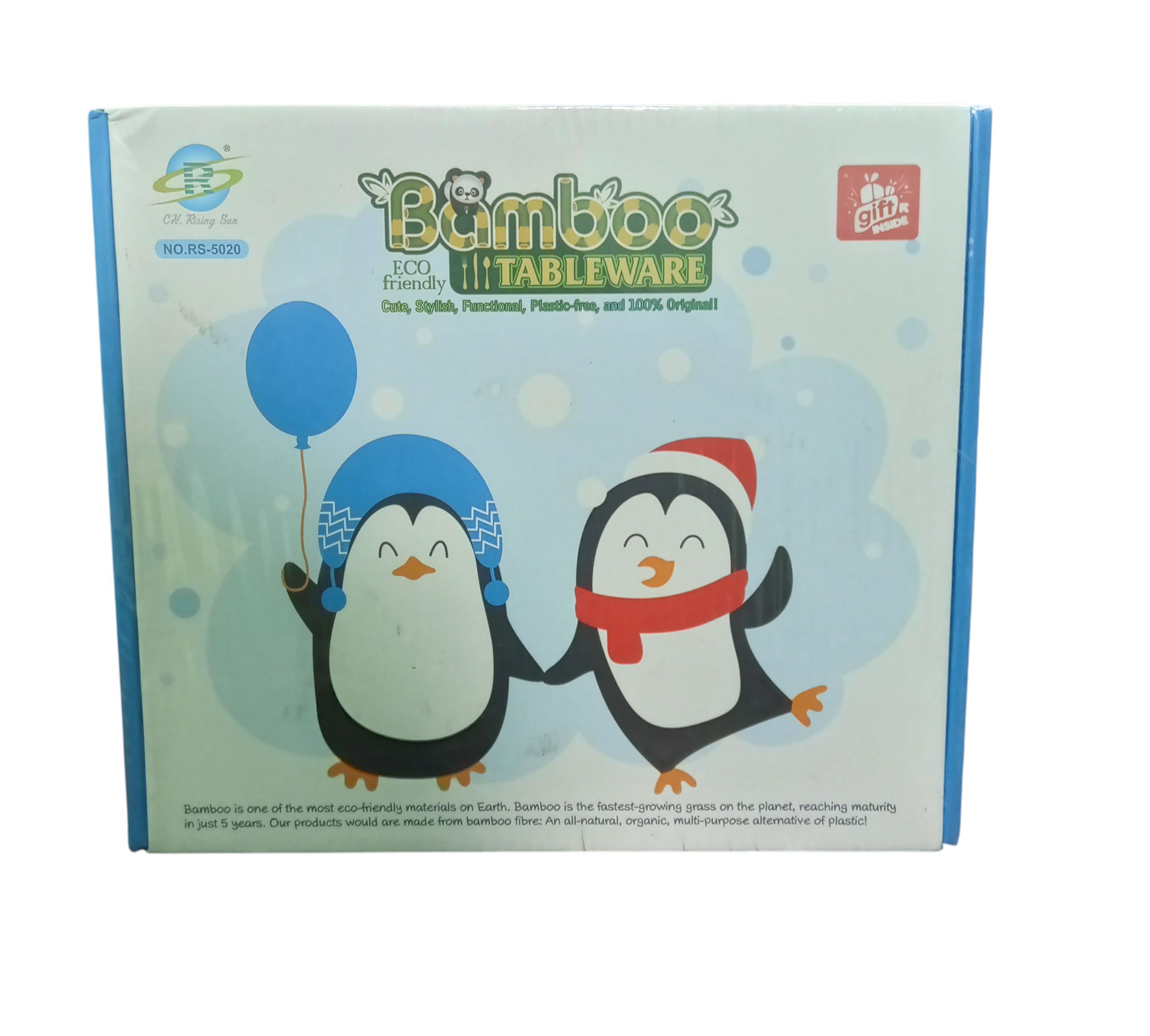 Eco-friendly bamboo fiber tableware set with cute penguin design, safe and stylish for kids.