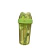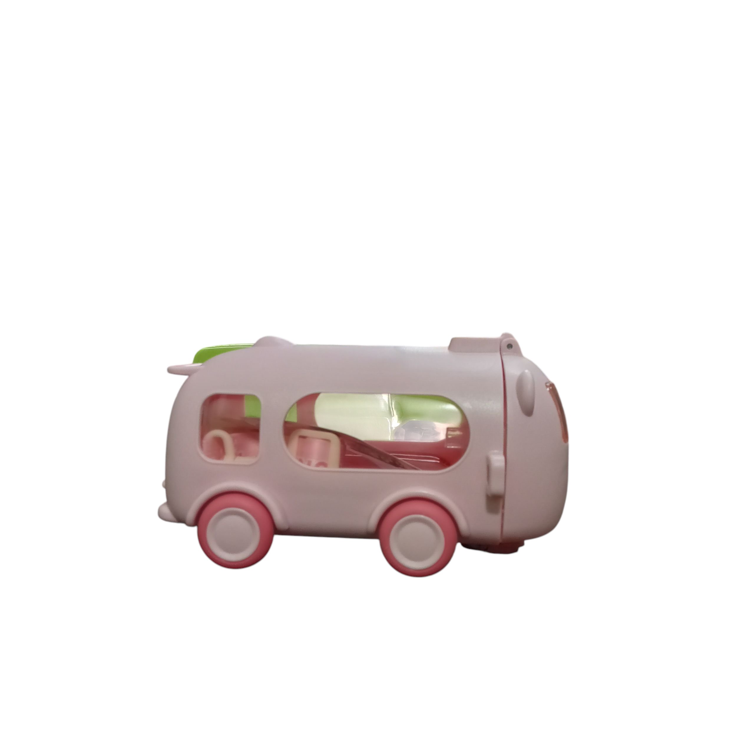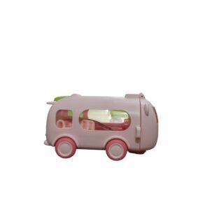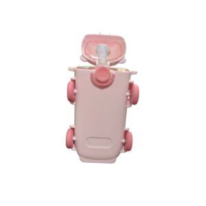 Adorable pink bus-shaped water bottle with wheels and flip-top straw lid, fun and practical for kids.
