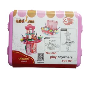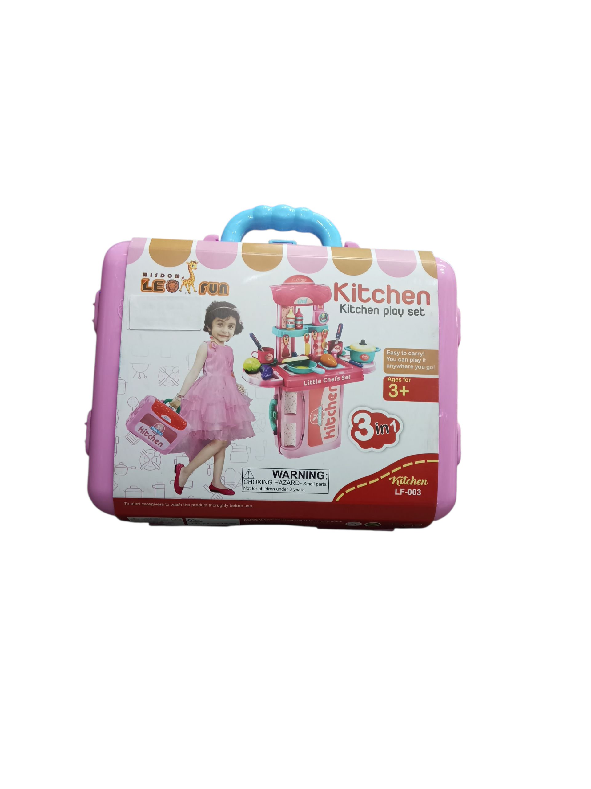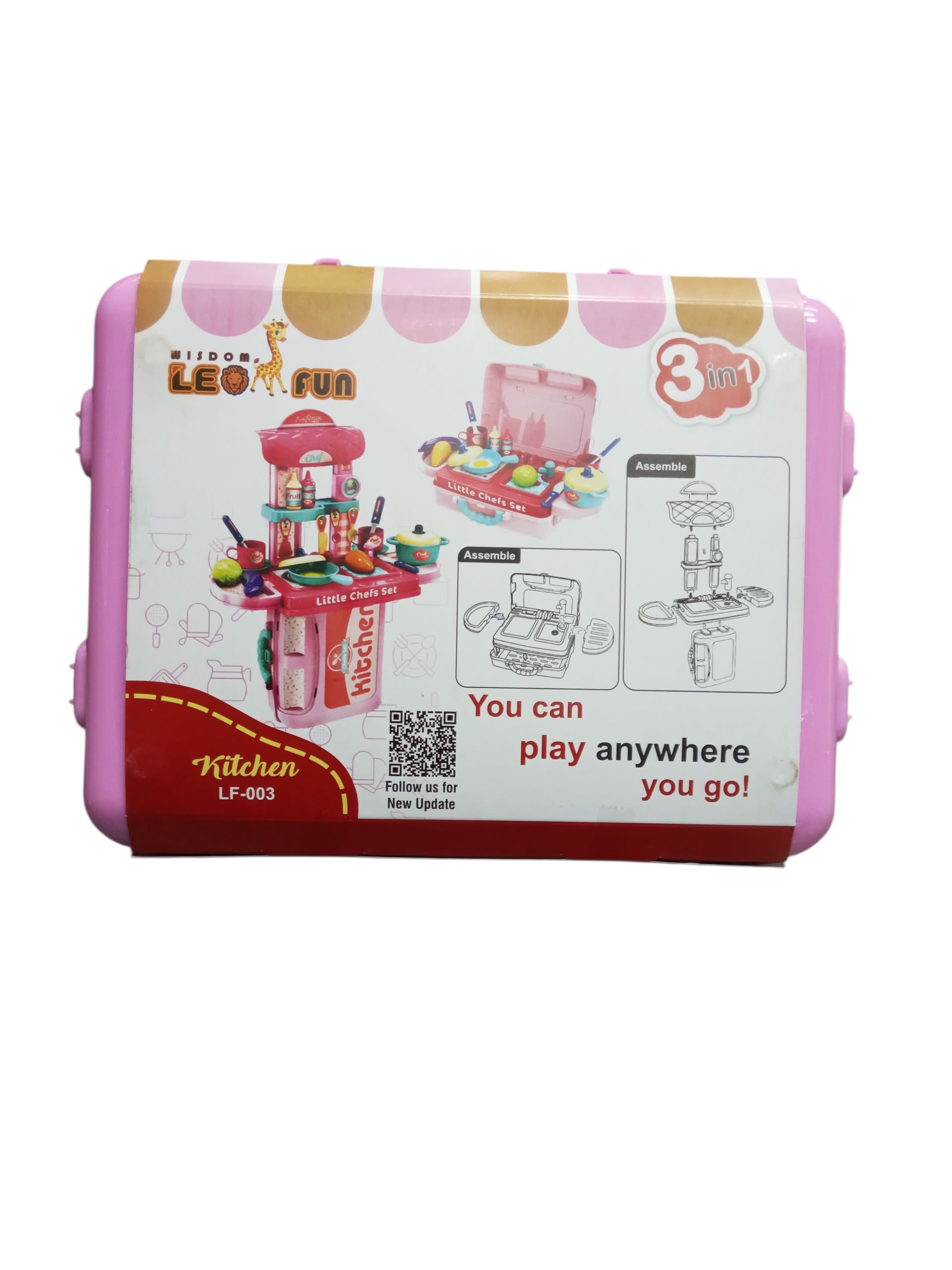 This is a Kitchen Play Set that comes packaged in a pink, portable suitcase. The packaging advertises it as a “3 in 1” set that is “Easy to carry! You can play it anywhere you go!” It includes a miniature, collapsible kitchen setup and is branded as “Lega Fun,” suggesting it is a children’s toy recommended for Ages 3+.