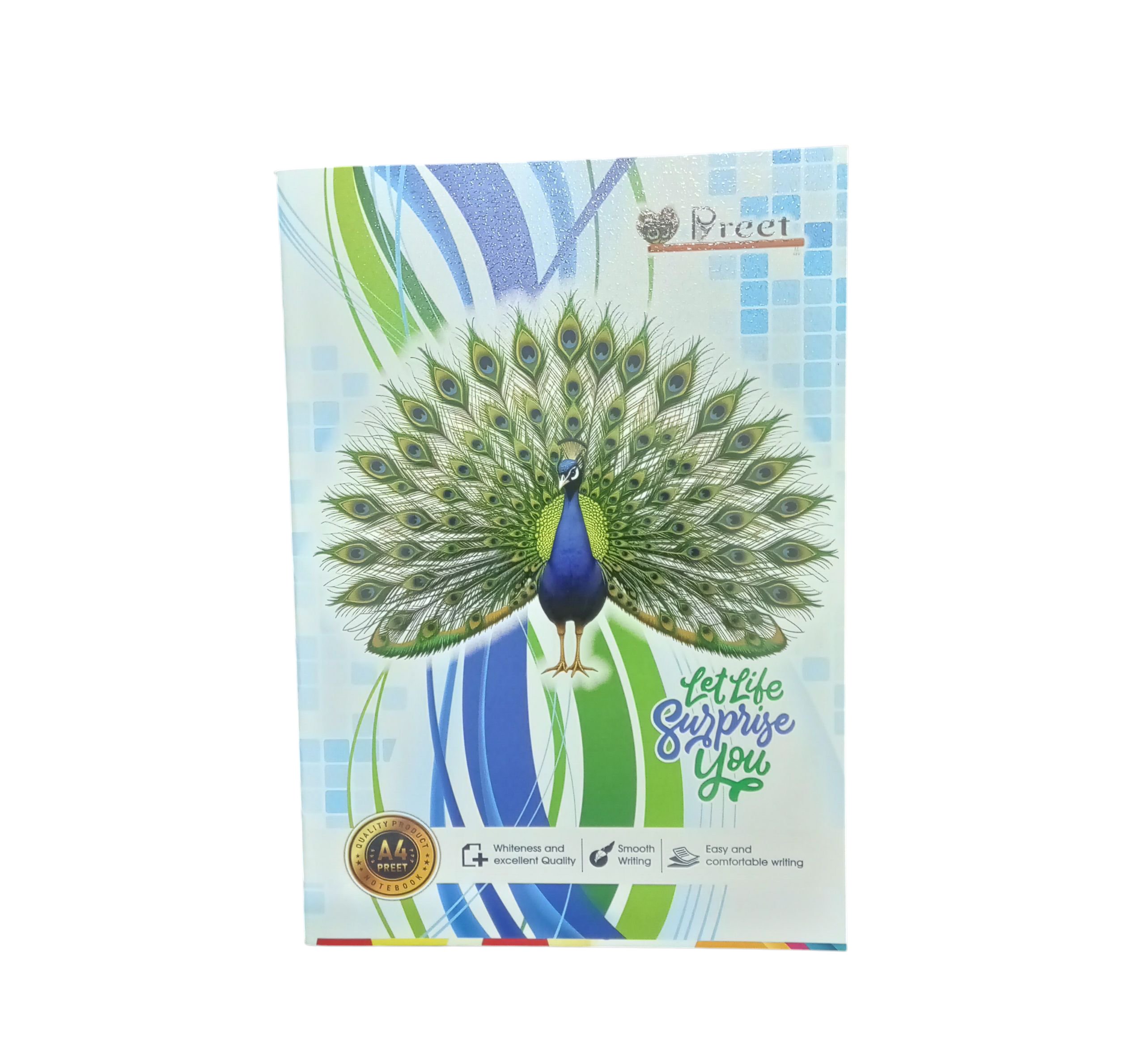 A4 notebook with a vibrant peacock design, offering smooth writing and excellent-quality white paper.