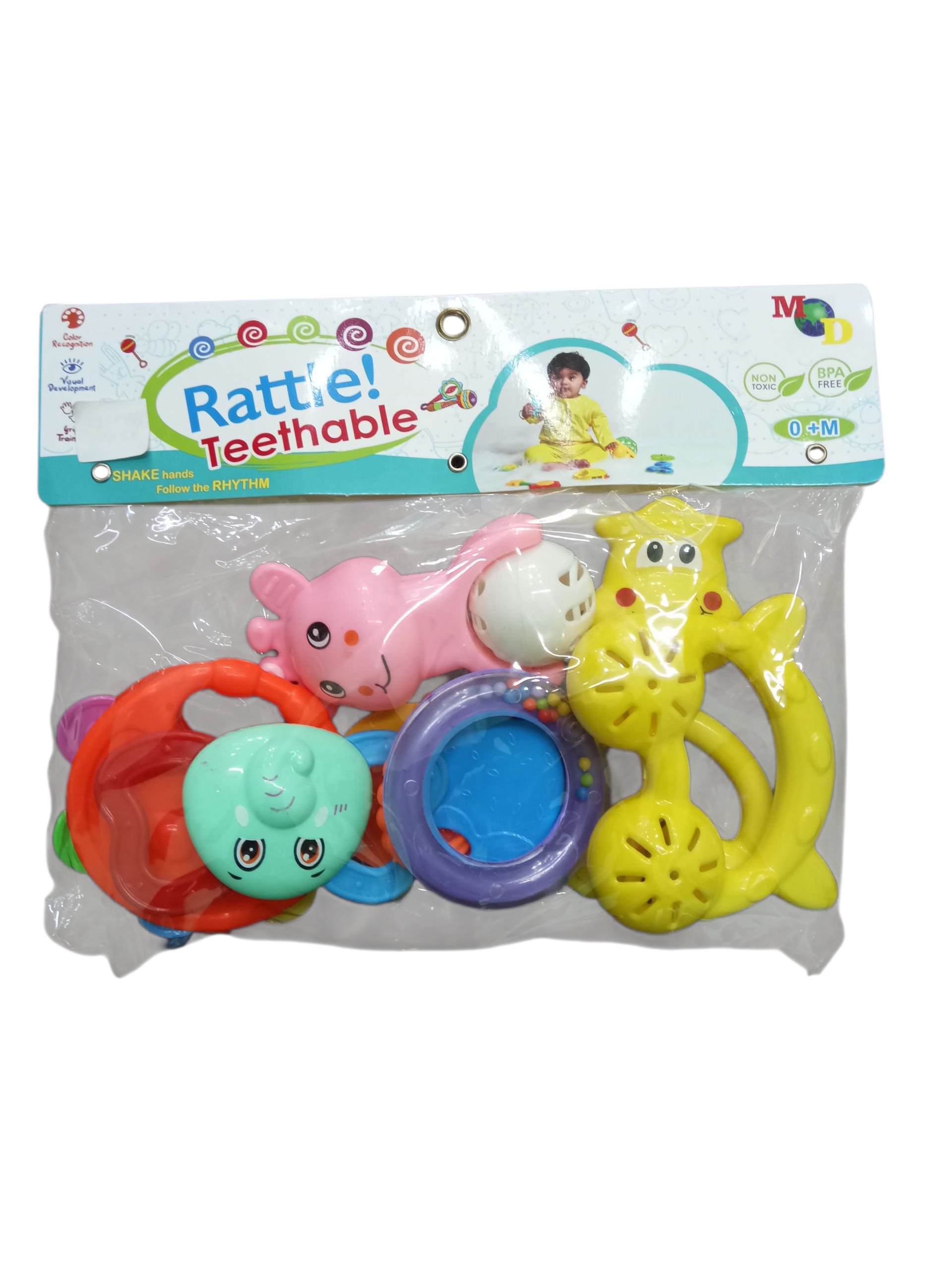 A packaged set of BPA-free, brightly colored rattles and teethable toys designed for newborns (mathbf{0+M}). The set includes various engaging plastic shapes, such as a yellow giraffe, a pink animal, and a blue/green elephant-like shape, all intended to be shaken to “Follow the RHYTHM” and provide soothing relief during teething.