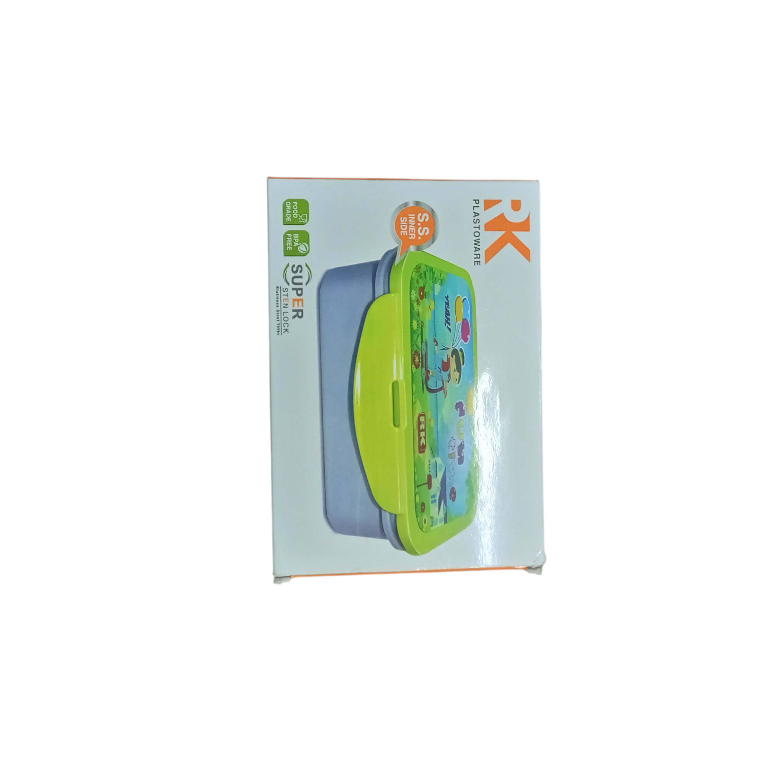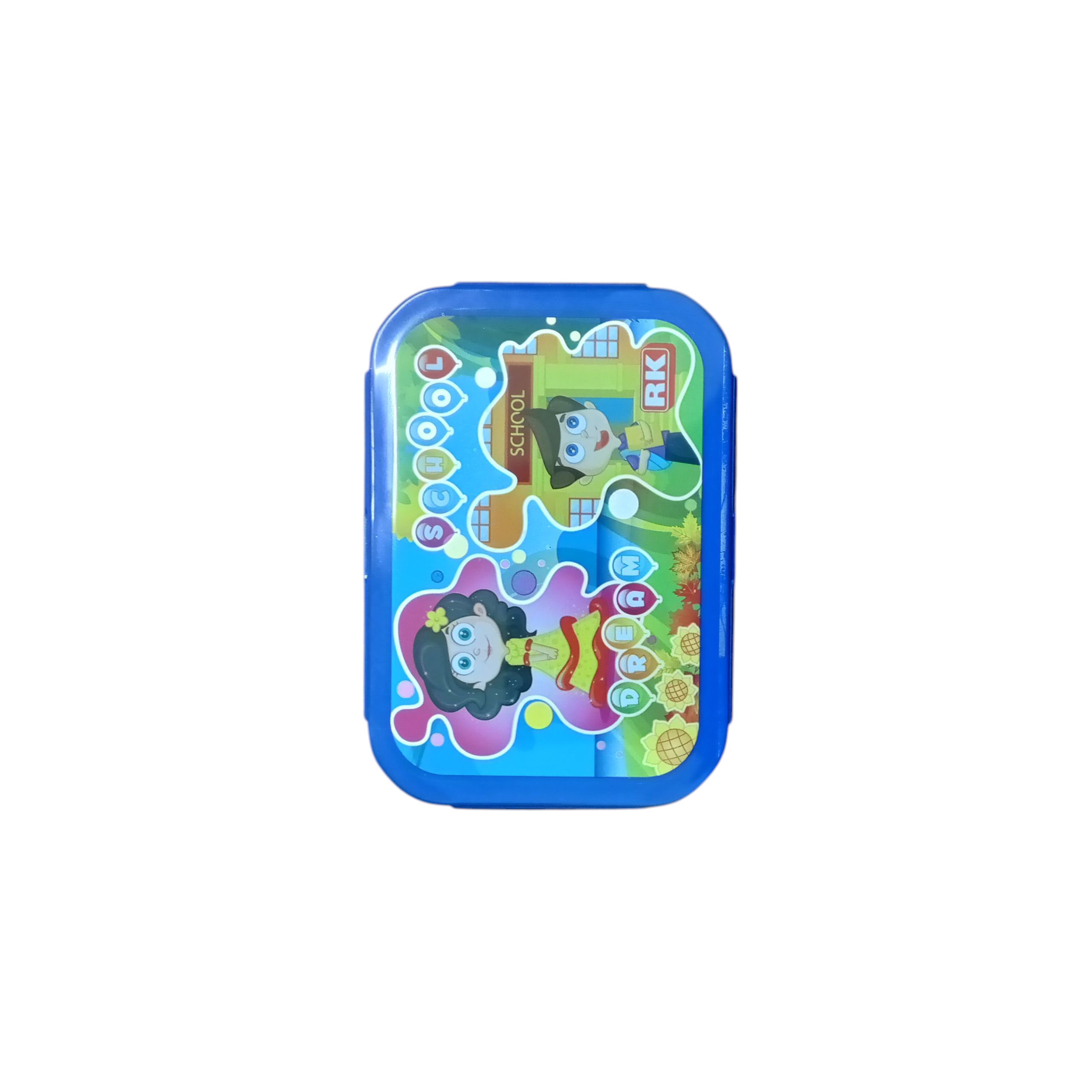 Durable plastic lunch box with a fun printed lid, perfect for kids’ school meals.
