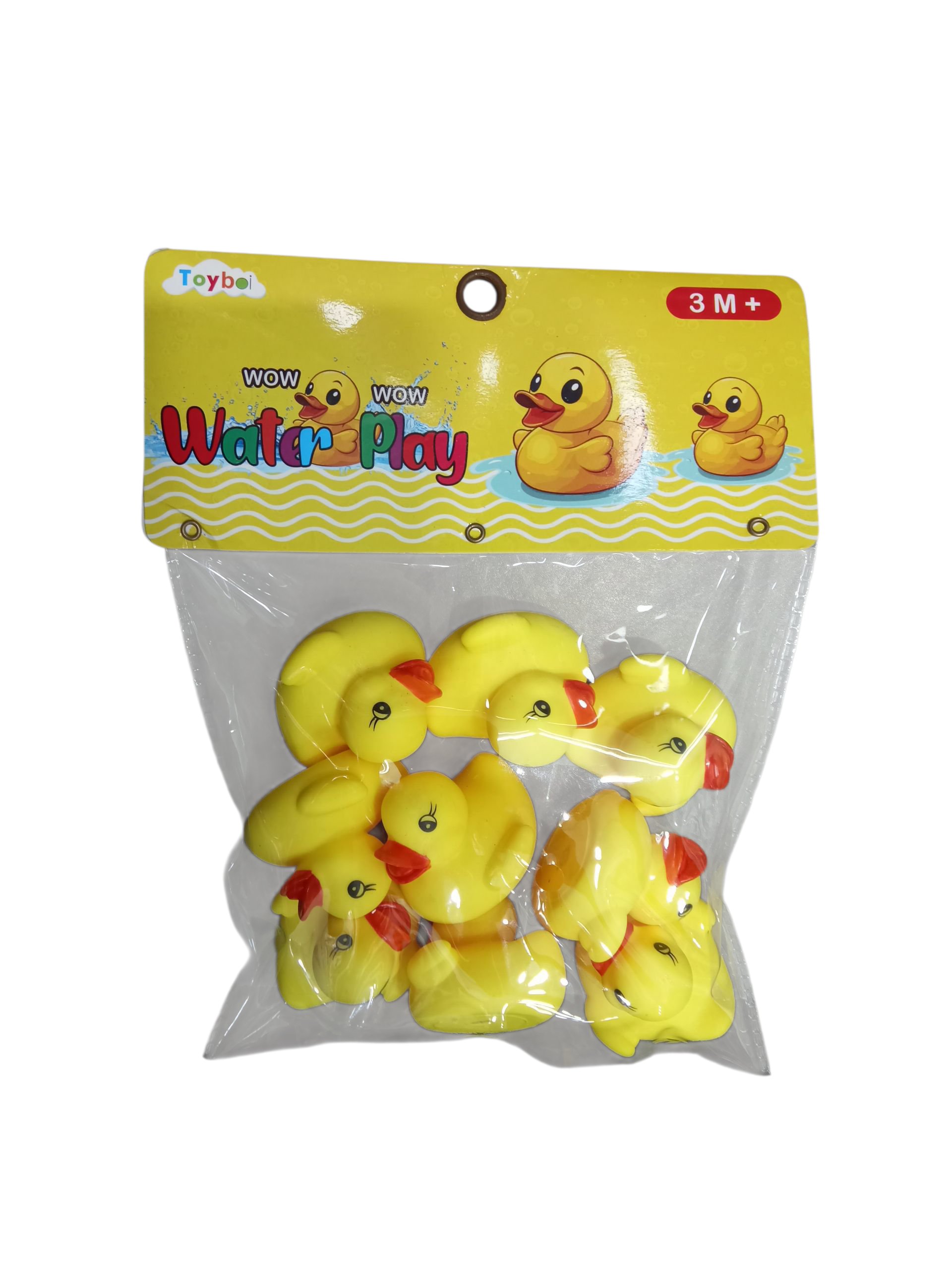 A set of multiple small, yellow, plastic or rubber ducks for bath time or general water play. The packaging is branded “Toybel,” labeled “WOW Water Play,” and is suitable for ages 3 months and up (3text{M+}).