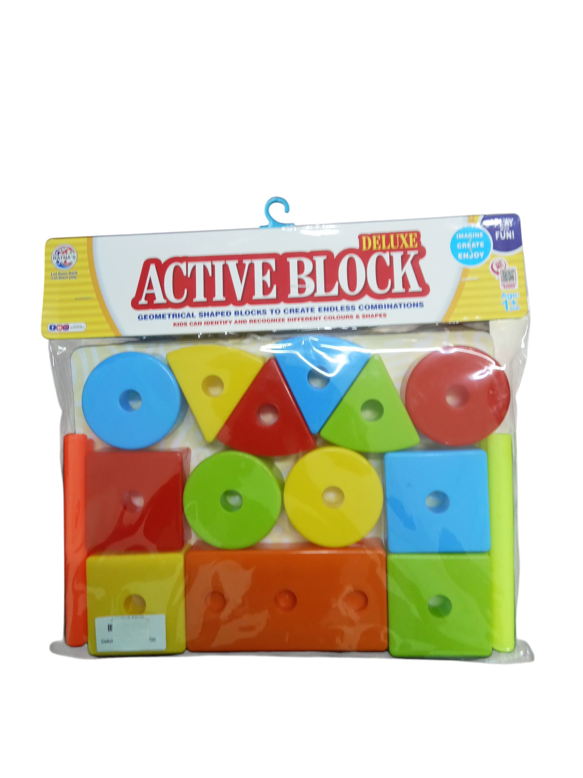 This product is a shape sorter toy with a red and blue cube. It comes with 18 colorful shapes, including hearts, stars, and other polygons. The packaging mentions that the toy helps children with fine motor skills, logical thinking, and observation skills. It is recommended for children aged 1 and above.