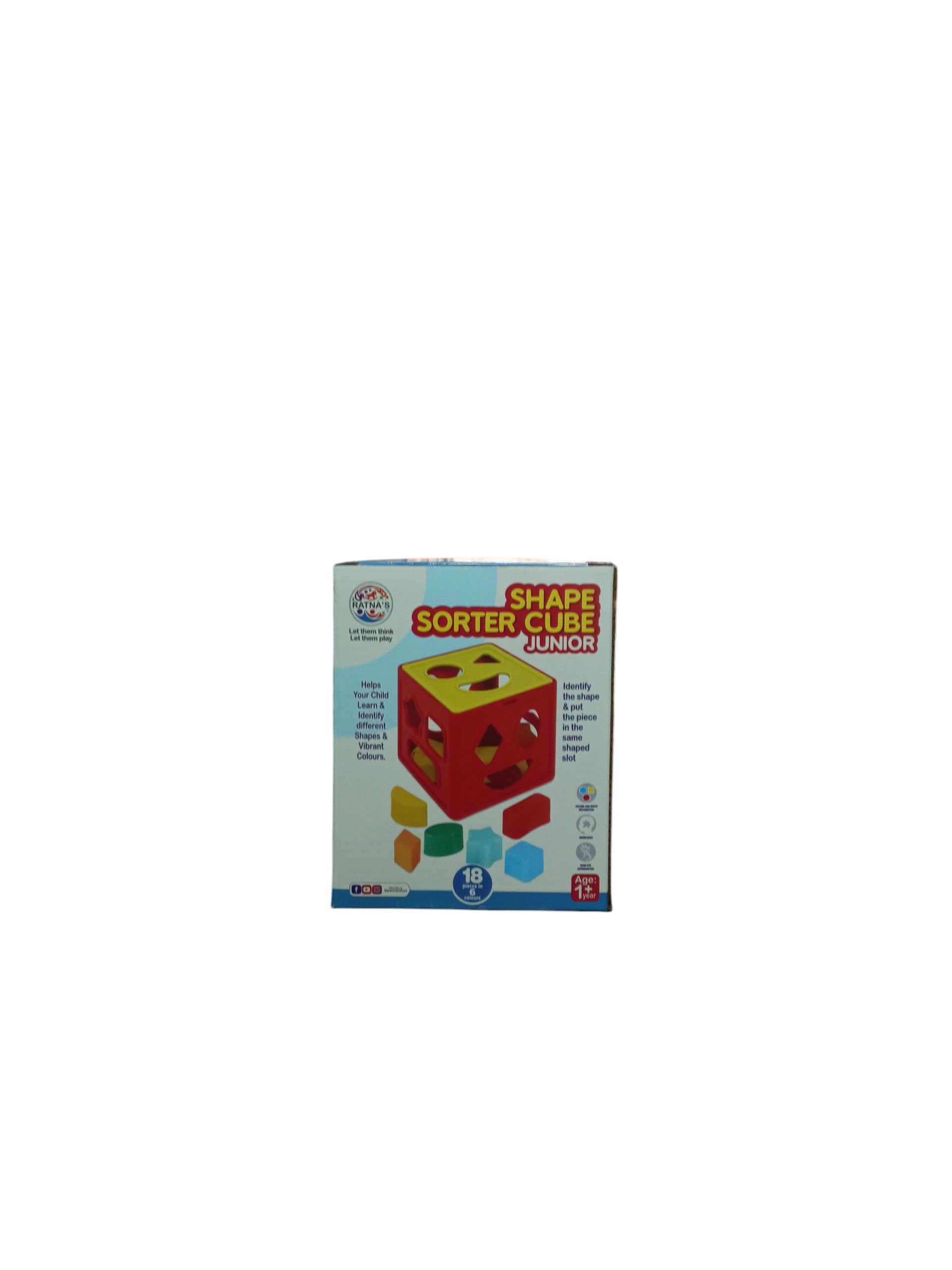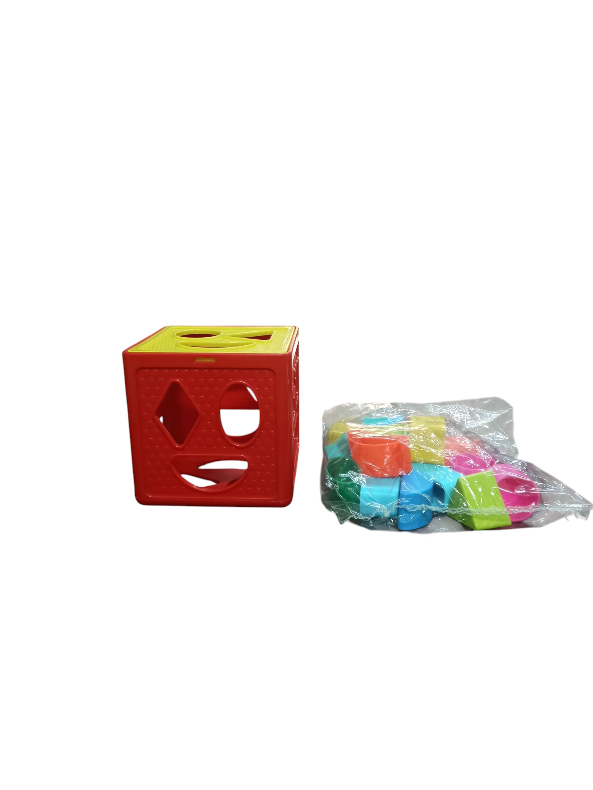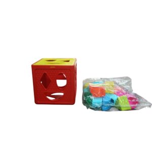 A colorful plastic shape-sorting cube with various geometric pieces, helping young children develop motor skills and shape recognition.