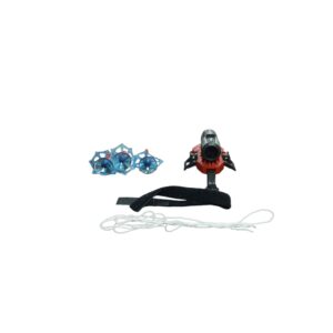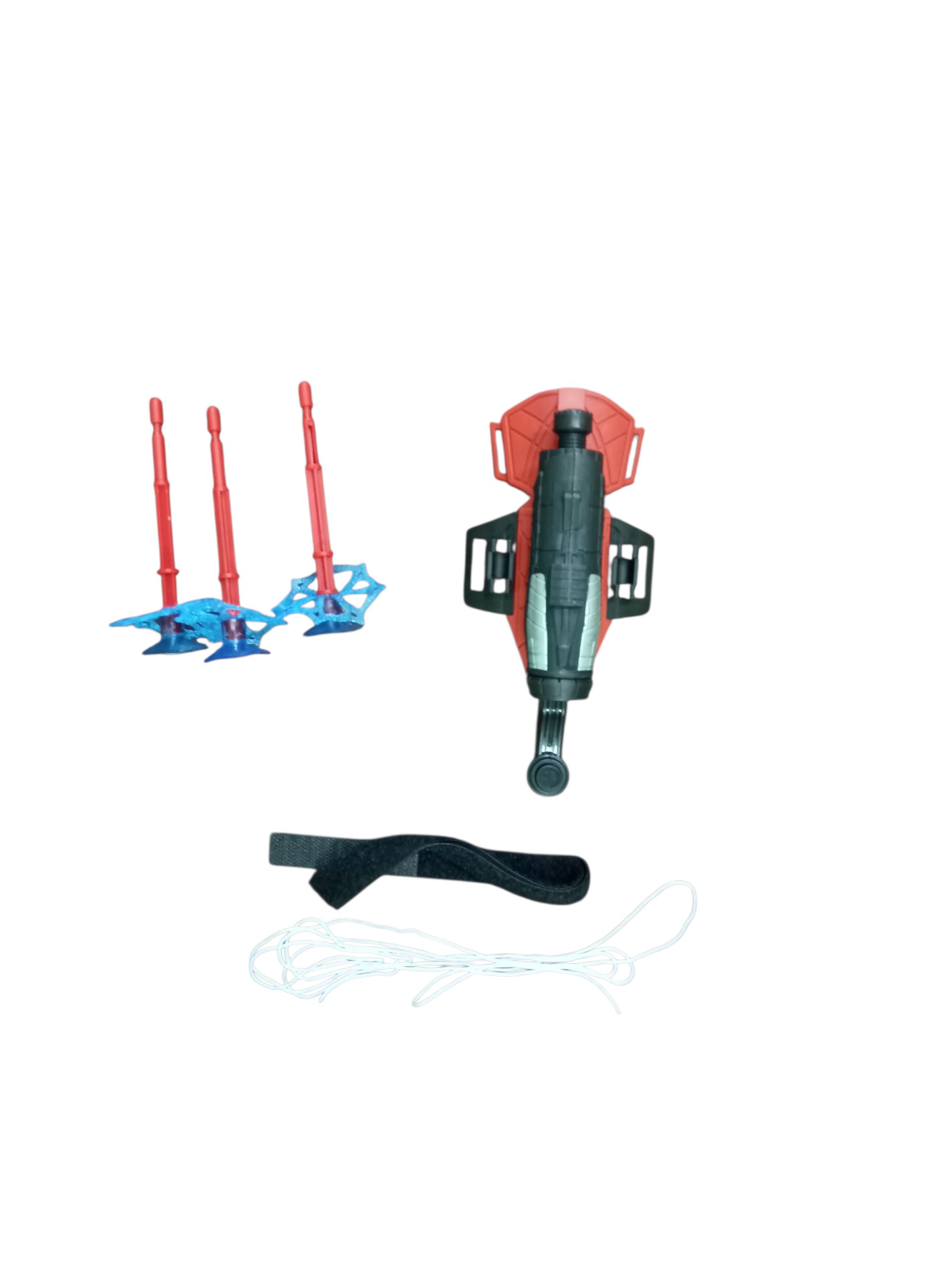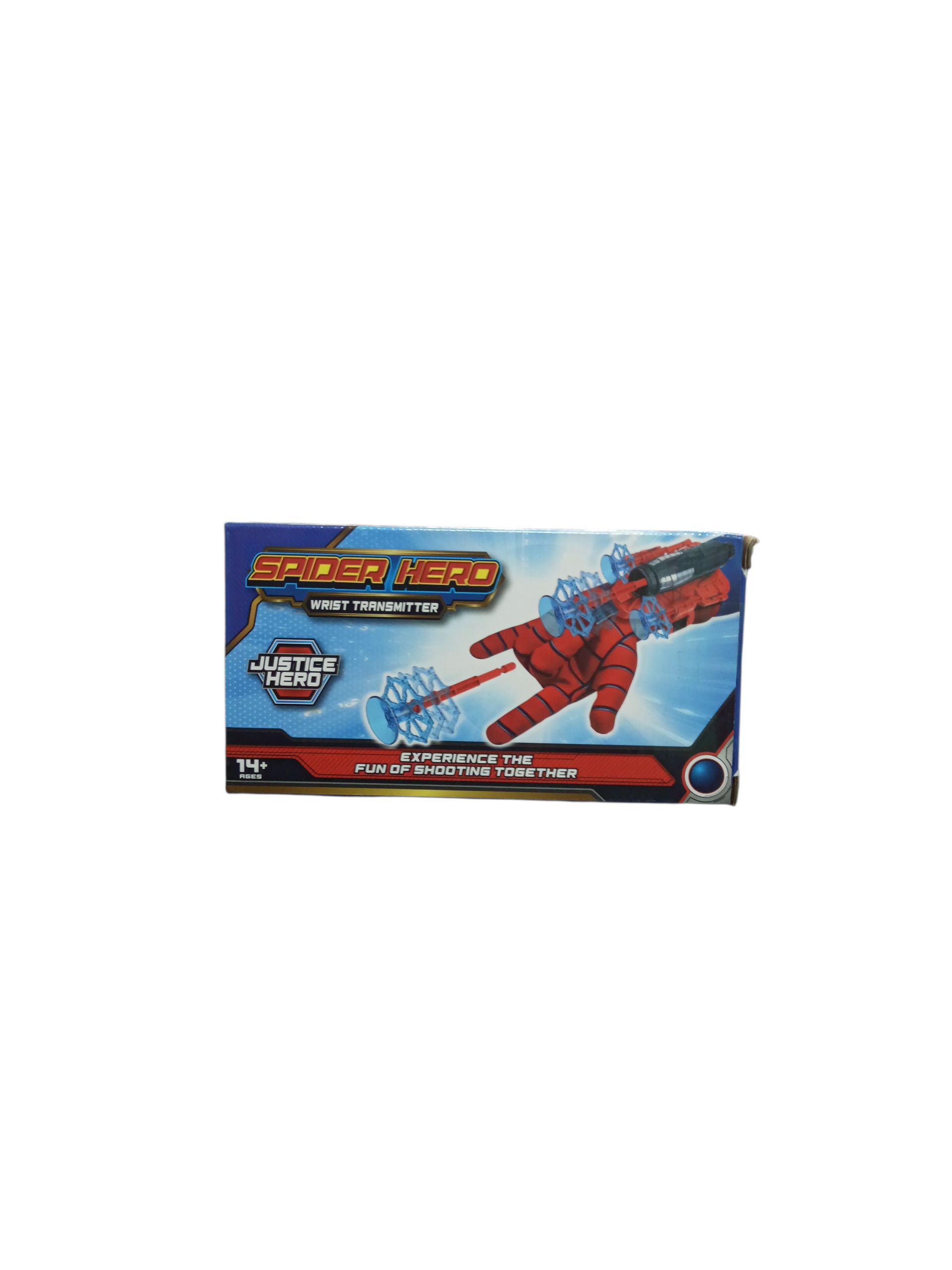 A toy wrist-worn device designed to mimic a superhero’s web-shooter or projectile launcher. The box displays a red glove-like accessory with a mechanism for “shooting” a plastic projectile. The packaging suggests it’s for ages 14+.