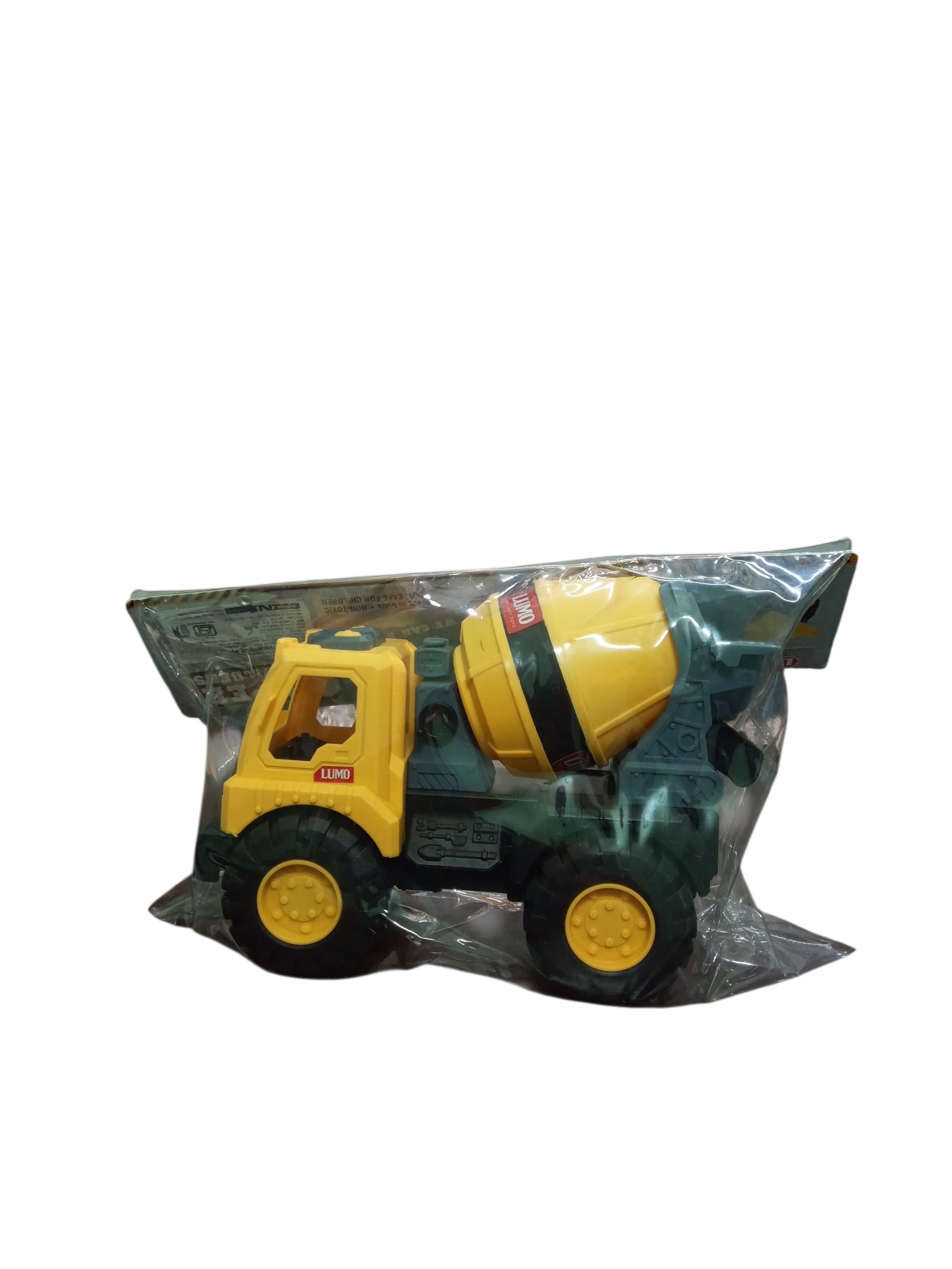 A yellow and dark-colored toy cement mixer truck with large wheels, packaged in a clear plastic bag. The LUMO brand is visible on the cab.