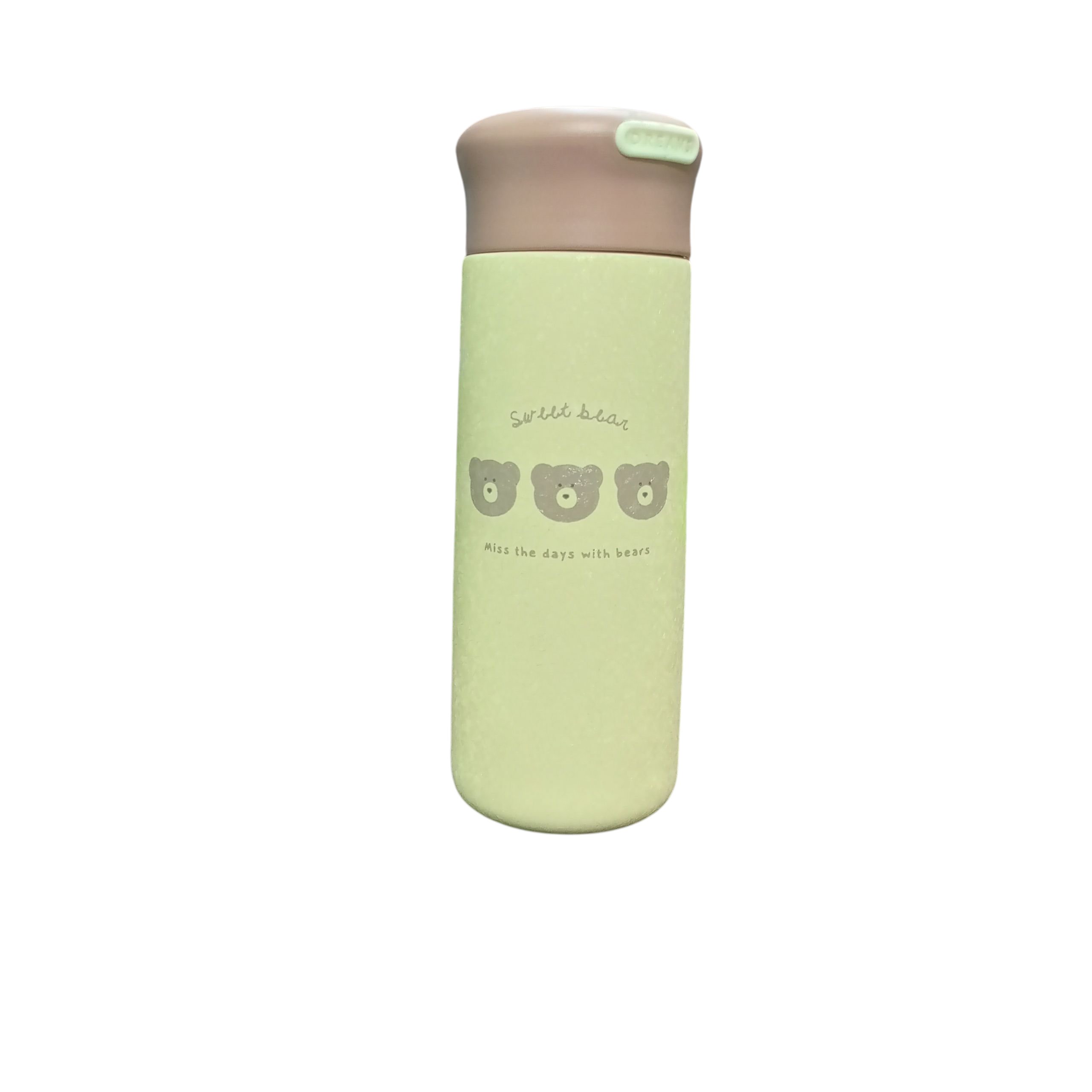 Adorable pastel vacuum flask with bear print – keeps drinks hot or cold, perfect for school or travel.