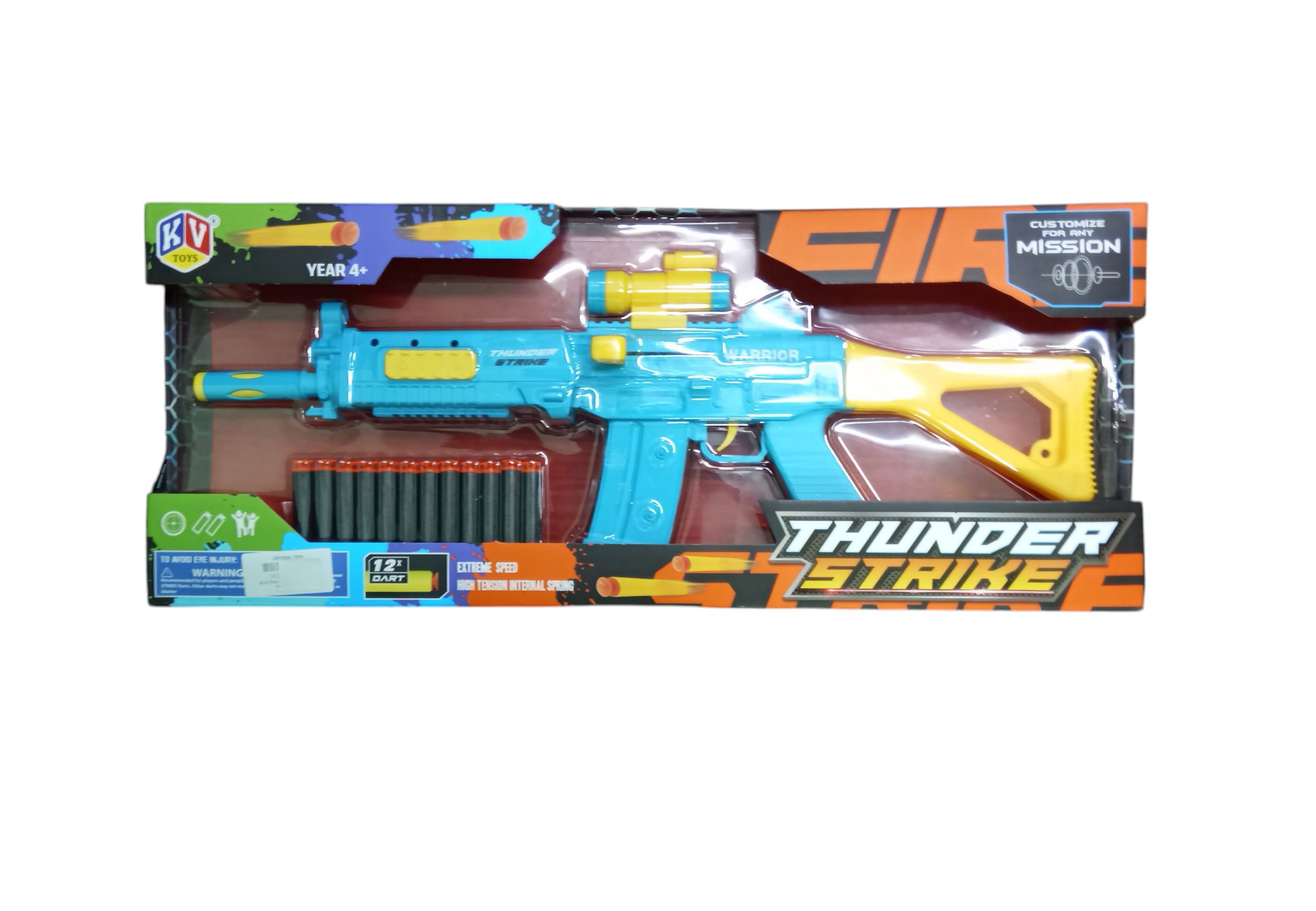 A toy gun with a bold blue and yellow design, shooting soft foam darts. Built for action play, it features a realistic rifle style for kids 4+.