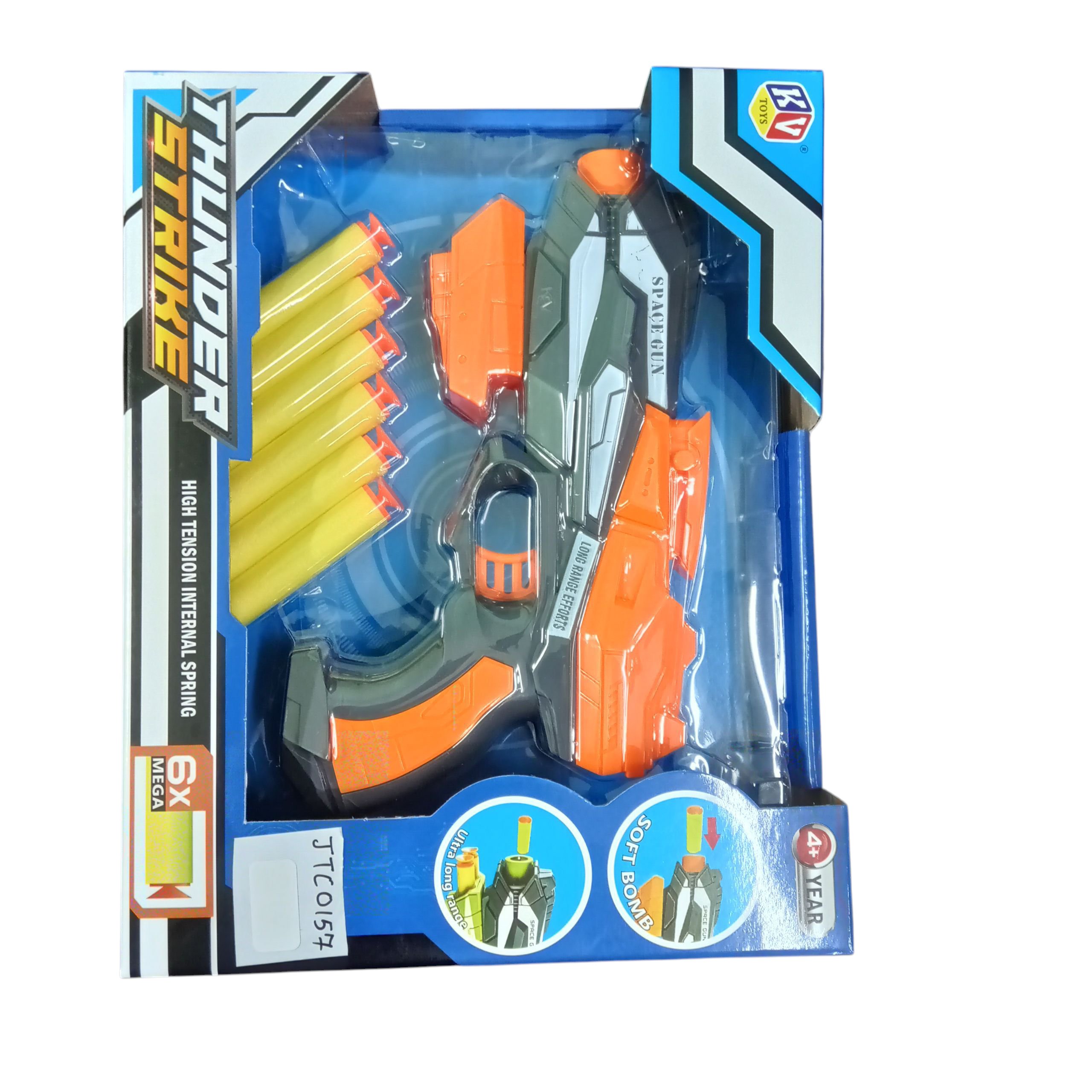 High-action Thunder Strike toy gun with 6 soft foam darts and high-tension internal spring for powerful shots. Designed for kids aged 4+, this soft bomb shooter is safe, exciting, and perfect for fun battles.