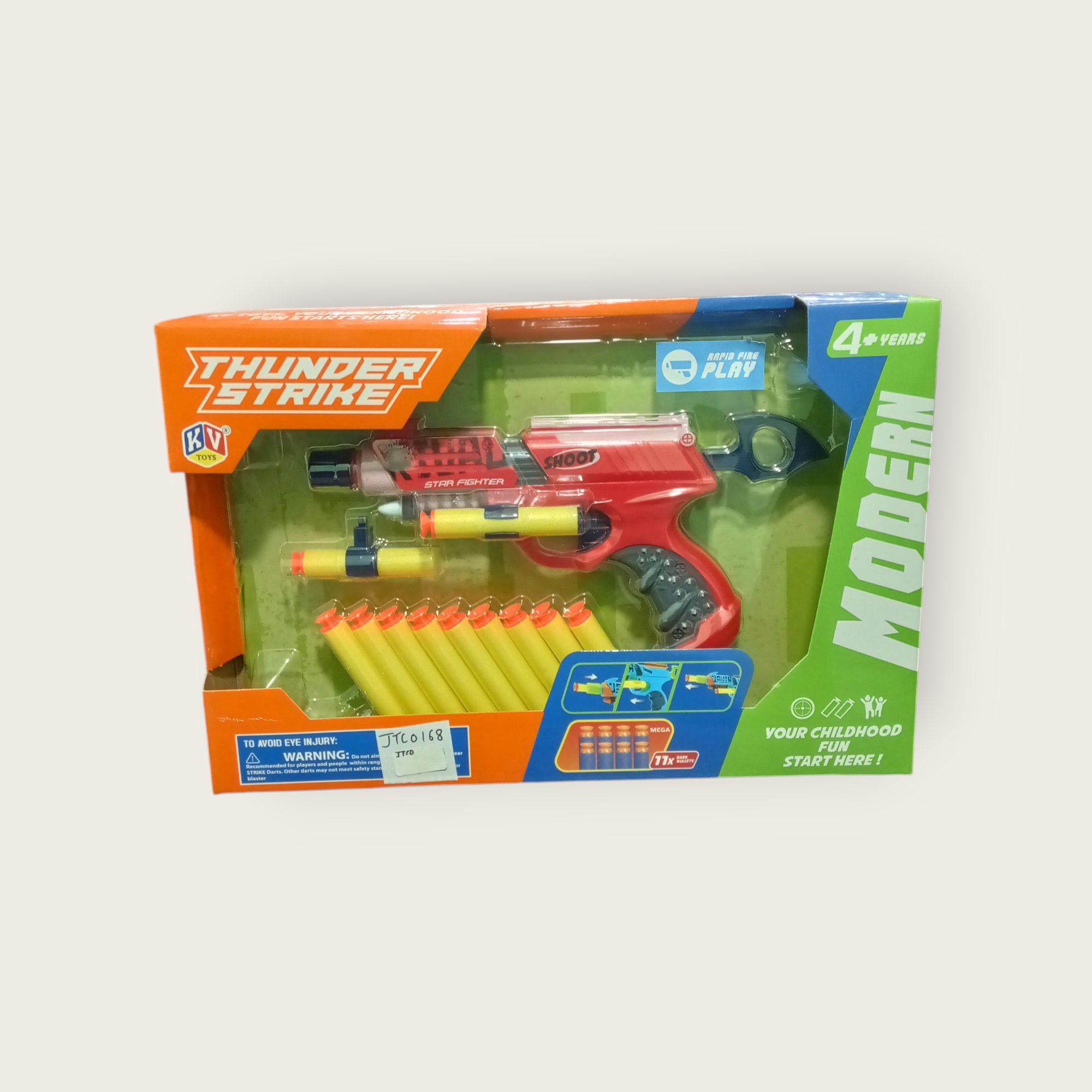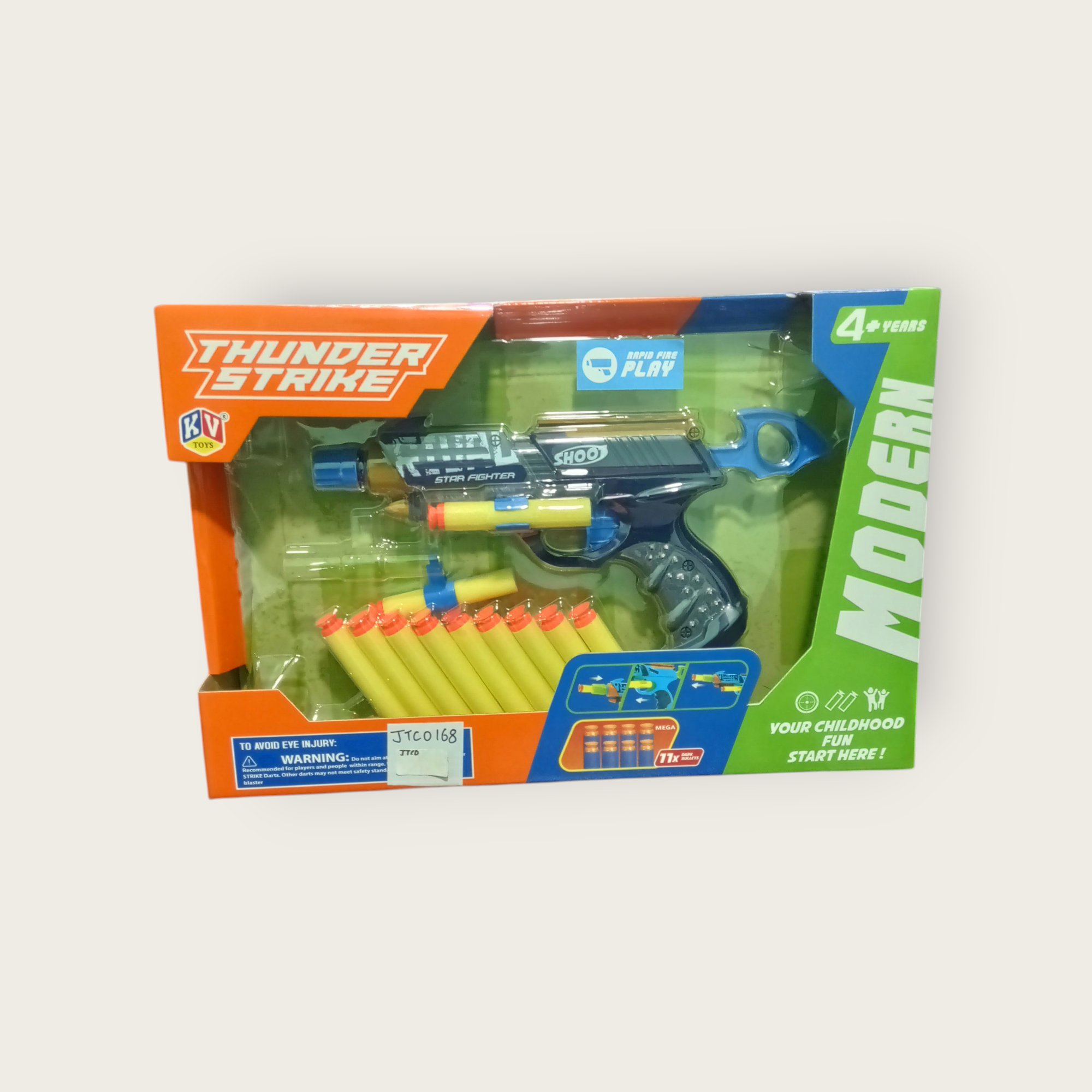 Get ready for action with the Thunder Strike Star Fighter Soft Bullet Gun! Designed for kids aged 4 and above, this toy gun comes with multiple soft foam darts for safe and exciting shooting play. With its cool design and easy grip, it’s perfect for indoor or outdoor fun. Let the battle begin with this ultimate blaster for young warriors!