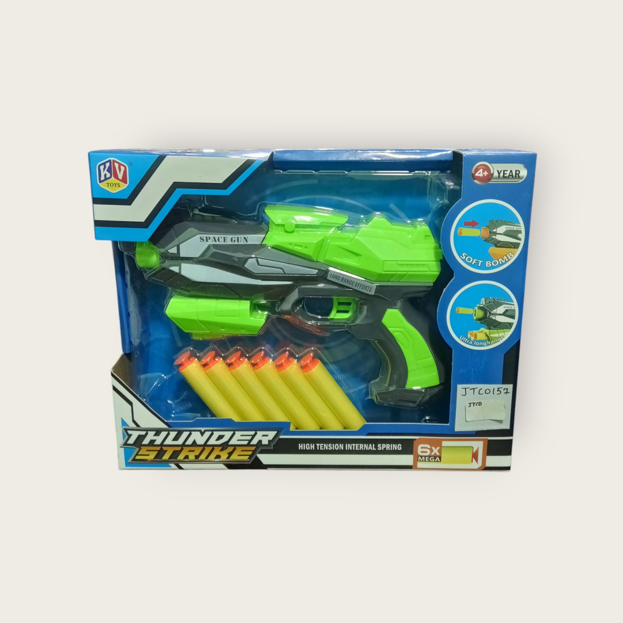 Blast into action with the Thunder Strike Space Gun! Designed with a high-tension internal spring for powerful shooting, this toy blaster comes with 6 soft foam bullets for safe and exciting play. Its futuristic design and long-range firing make it a hit among kids aged 4 and above. Gear up for epic space battles with this cool soft bomb shooter!