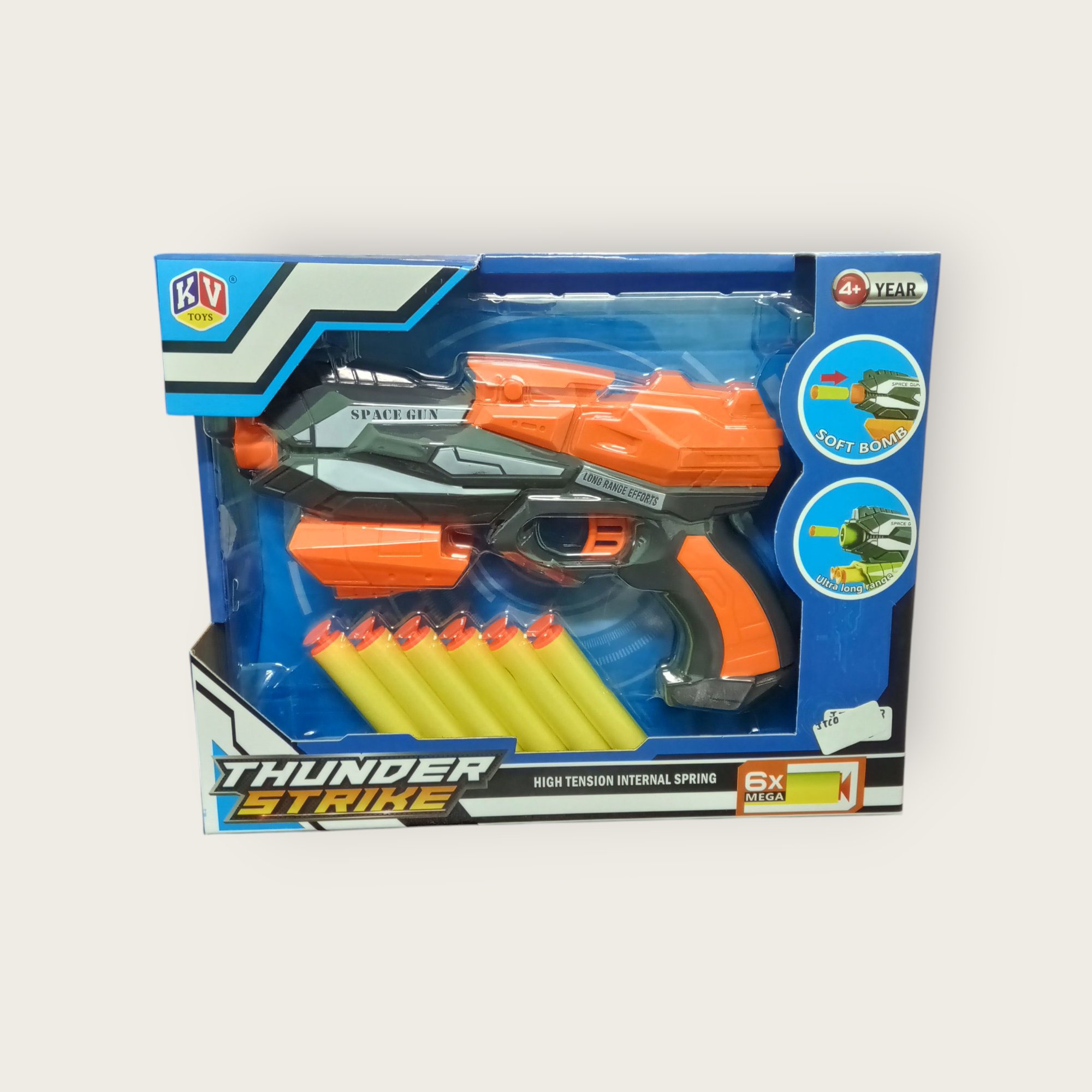 Gear up for action with the Thunder Strike Space Gun! 🚀 Equipped with 6 soft foam darts and a high-tension internal spring, this blaster is built for long-range shooting fun. Safe, durable, and perfect for kids aged 4+.