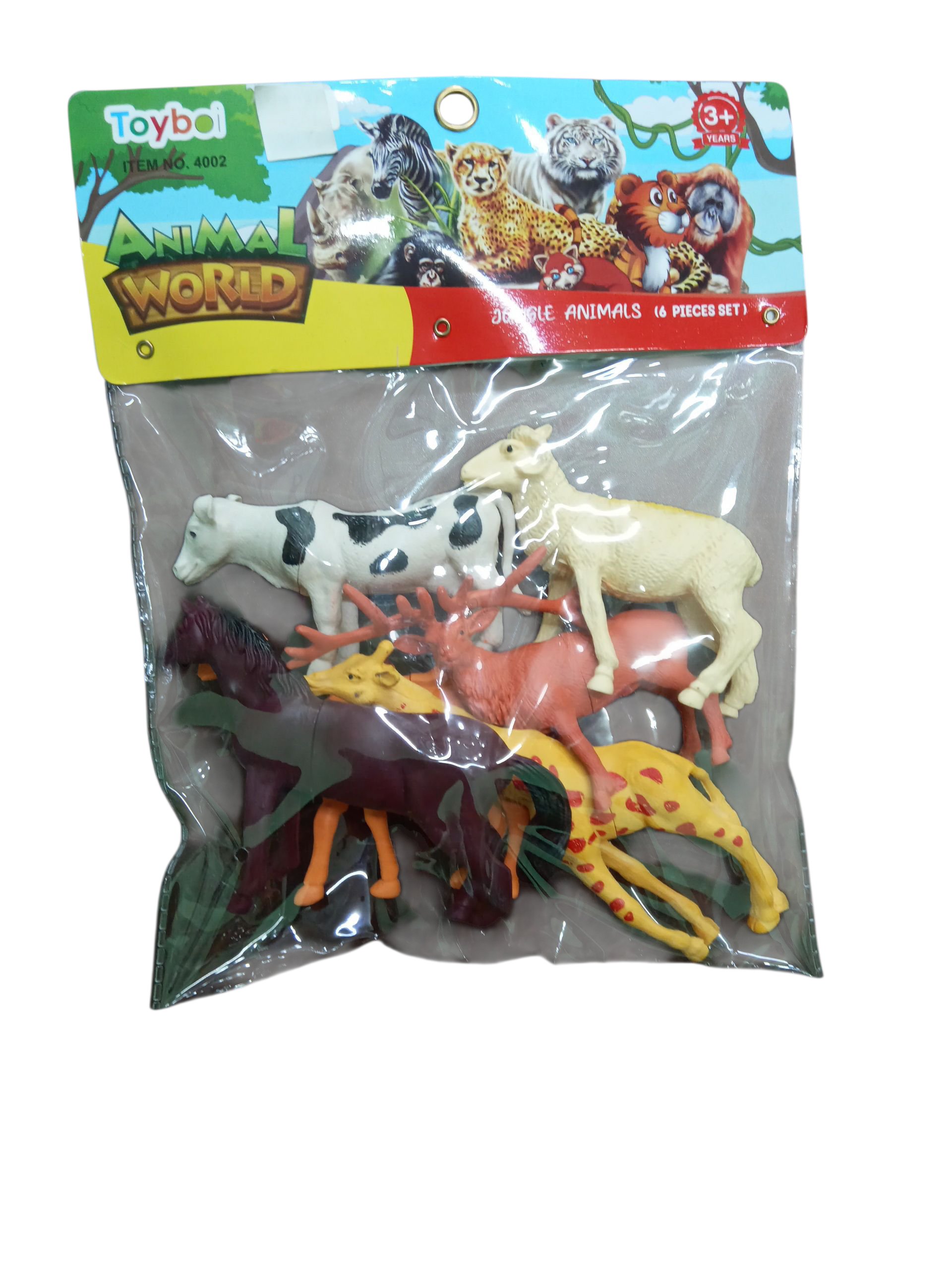 A 6-piece set of various plastic jungle and farm animal figures (e.g., cow, deer, giraffe).